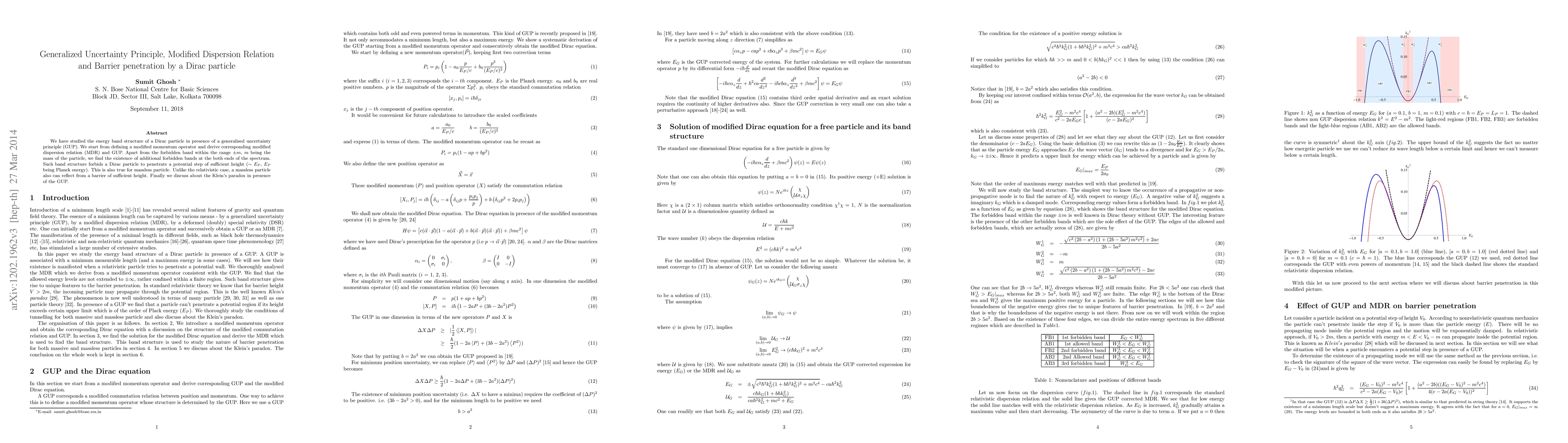 We have studied the energy band structure of a Dirac particle in presence of a generalised uncertainty principle (GUP). We start from defining a modified momentum operator and derive corresponding modified dispersion relation (MDR) and GUP. Apart from the forbidden band within the range $\pm m$, $m$ being the mass of the particle, we find the existence of additional forbidden bands at the both ends of the spectrum. Such band structure forbids a Dirac particle to penetrate a potential step of sufficient height ($\sim E_P$, $E_P$ being Planck energy). This is also true for massless particle. Unlike the relativistic case, a massless particle also can reflect from a barrier of sufficient height. Finally we discuss about the Klein's paradox in presence of the GUP.
