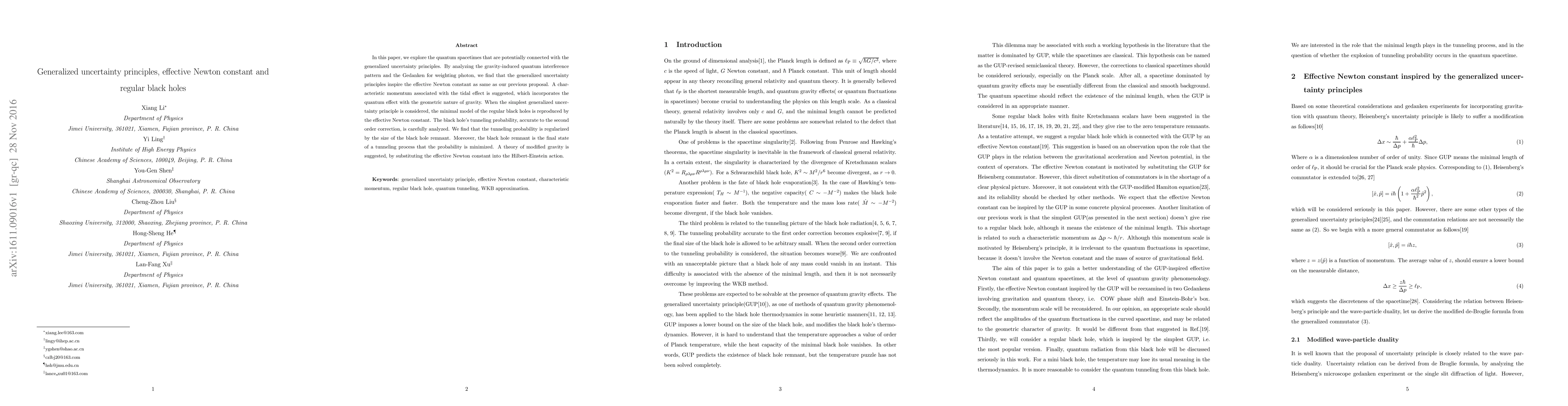 In this paper, we explore the quantum spacetimes that are potentially connected with the generalized uncertainty principles. By analyzing the gravity-induced quantum interference pattern and the Gedanken for weighting photon, we find that the generalized uncertainty principles inspire the effective Newton constant as same as our previous proposal. A characteristic momentum associated with the tidal effect is suggested, which incorporates the quantum effect with the geometric nature of gravity. When the simplest generalized uncertainty principle is considered, the minimal model of the regular black holes is reproduced by the effective Newton constant. The black hole's tunneling probability, accurate to the second order correction, is carefully analyzed. We find that the tunneling probability is regularized by the size of the black hole remnant. Moreover, the black hole remnant is the final state of a tunneling process that the probability is minimized. A theory of modified gravity is suggested, by substituting the effective Newton constant into the Hilbert-Einstein action.