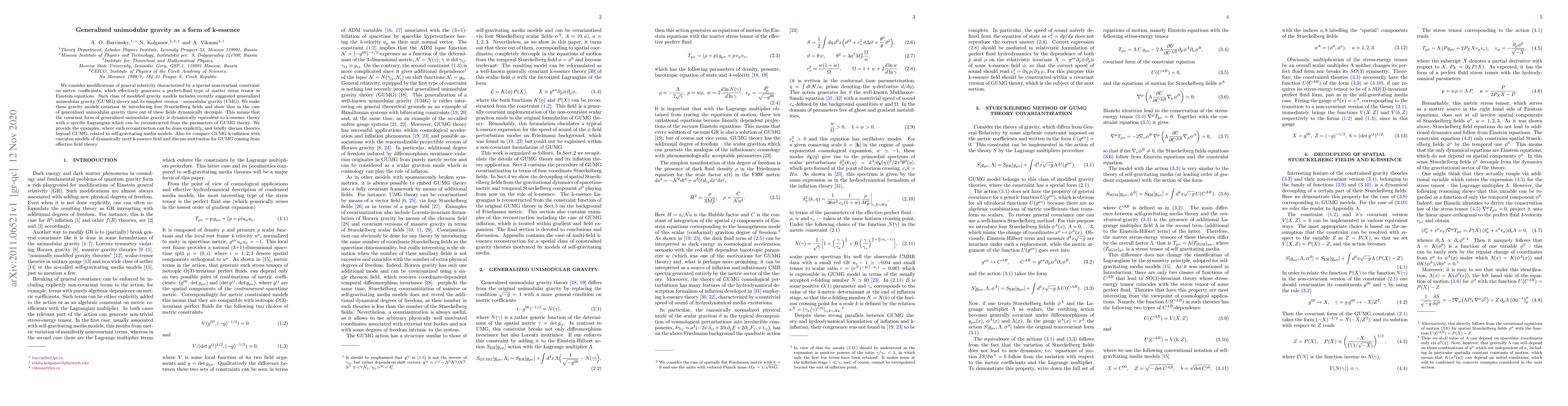We consider modifications of general relativity characterized by a special noncovariant constraint on metric coefficients, which effectively generates a perfect-fluid type of matter stress tensor in Einstein equations. Such class of modified gravity models includes recently suggested generalized unimodular gravity (GUMG) theory and its simplest version -- unimodular gravity (UMG). We make these gravity models covariant by introducing four Stueckelberg fields and show that in the case of generalized unimodular gravity three out of these fields dynamically decouple. This means that the covariant form of generalized unimodular gravity is dynamically equivalent to k-essence theory with a specific Lagrangian which can be reconstructed from the parameters of GUMG theory. We provide the examples, where such reconstruction can be done explicitly, and briefly discuss theories beyond GUMG, related to self-gravitating media models. Also we compare GUMG k-inflation with cuscuton models of dynamically inert k-essence field and discuss motivation for GUMG coming from effective field theory.