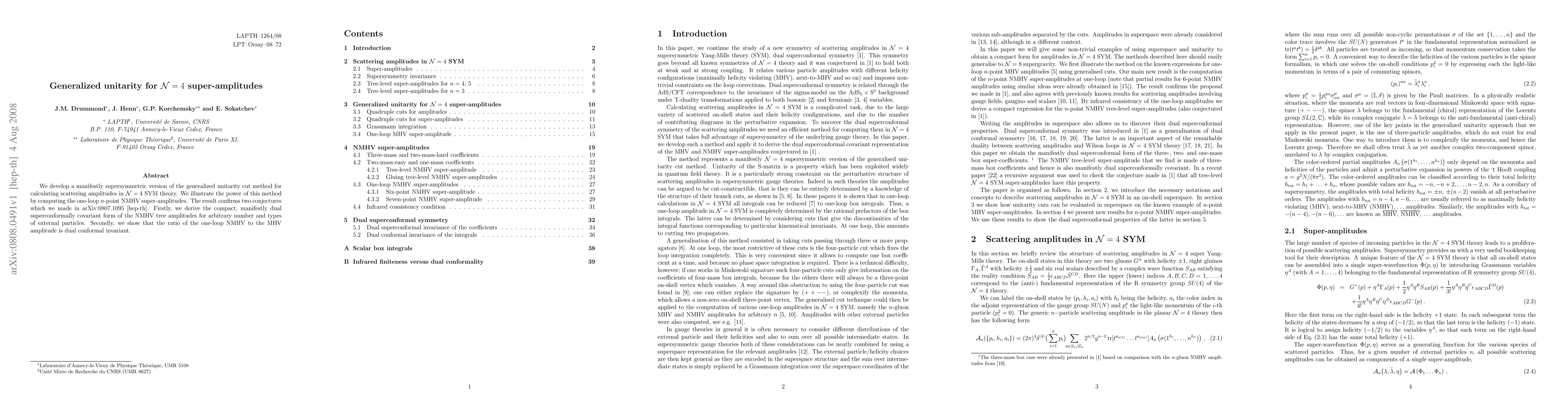 We develop a manifestly supersymmetric version of the generalized unitarity cut method for calculating scattering amplitudes in N=4 SYM theory. We illustrate the power of this method by computing the one-loop n-point NMHV super-amplitudes. The result confirms two conjectures which we made in arXiv:0807.1095 [hep-th]. Firstly, we derive the compact, manifestly dual superconformally covariant form of the NMHV tree amplitudes for arbitrary number and types of external particles. Secondly, we show that the ratio of the one-loop NMHV to the MHV amplitude is dual conformal invariant.