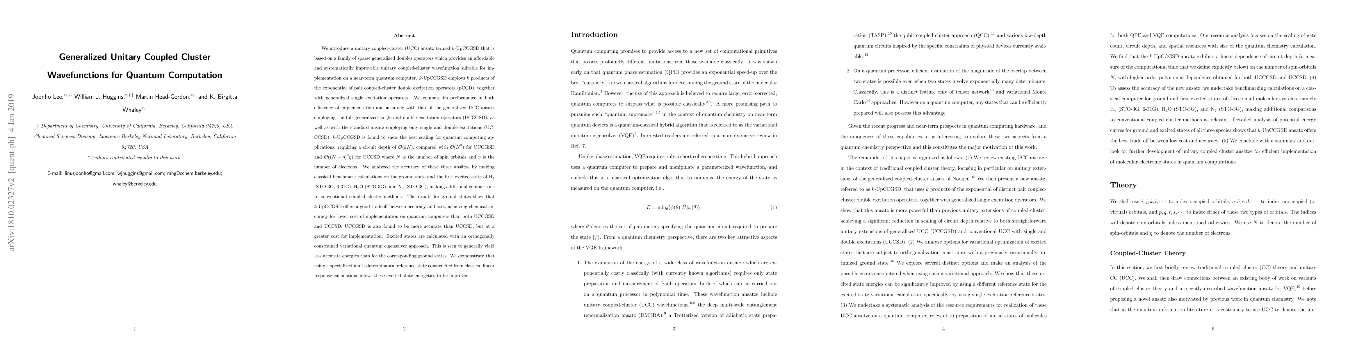 This paper introduces the $k$-UpCCGSD ansatz, a scalable unitary coupled-cluster wavefunction for quantum computation, based on sparse generalized doubles operators. It demonstrates that $k$-UpCCGSD offers better efficiency and a good accuracy-cost tradeoff compared to UCCGSD and UCCSD, achieving chemical accuracy for ground states at lower quantum circuit depth.
