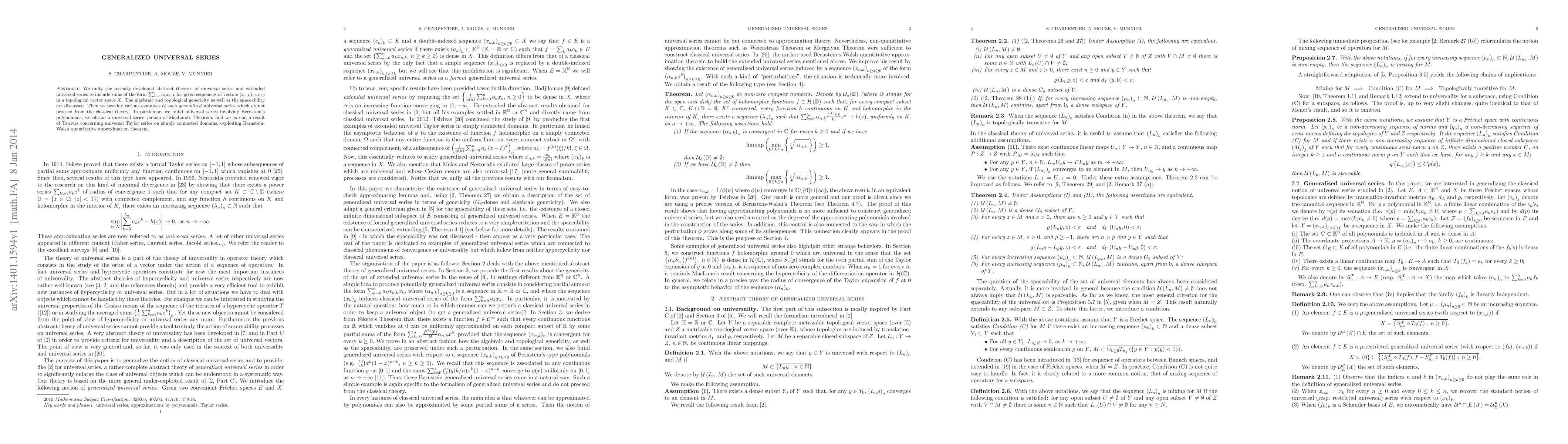 We unify the recently developed abstract theories of universal series and extended universal series to include sums of the form $\sum_{k=0}^n a_k x_{n,k}$ for given sequences of vectors $(x_{n,k})_{n\geq k\geq 0}$ in a topological vector space X. The algebraic and topological genericity as well as the spaceability are discussed. Then we provide various examples of such generalized universal series which do not proceed from the classical theory. In particular, we build universal series involving Bernstein's polynomials, we obtain a universal series version of MacLane's Theorem, and we extend a result of Tsirivas concerning universal Taylor series on simply connected domains, exploiting Bernstein- Walsh quantitative approximation theorem.