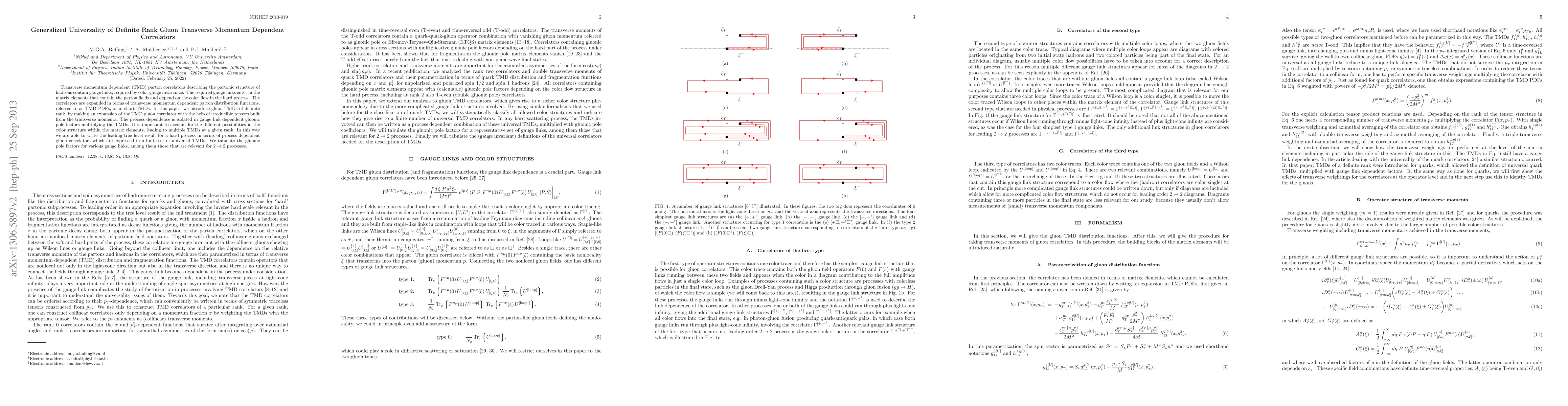 Transverse momentum dependent (TMD) parton correlators describing the partonic structure of hadrons contain gauge links, required by color gauge invariance. The required gauge links enter in the matrix elements that contain the parton fields and depend on the color flow in the hard process. The correlators are expanded in terms of transverse momentum dependent parton distribution functions, referred to as TMD PDFs, or in short TMDs. In this paper, we introduce gluon TMDs of definite rank, by making an expansion of the TMD gluon correlator with the help of irreducible tensors built from the transverse momenta. The process dependence is isolated in gauge link dependent gluonic pole factors multiplying the TMDs. It is important to account for the different possibilities in the color structure within the matrix elements, leading to multiple TMDs at a given rank. In this way we are able to write the leading tree level result for a hard process in terms of process dependent gluon correlators which are expressed in a finite set of universal TMDs. We tabulate the gluonic pole factors for various gauge links, among them those that are relevant for 2 to 2 processes.
