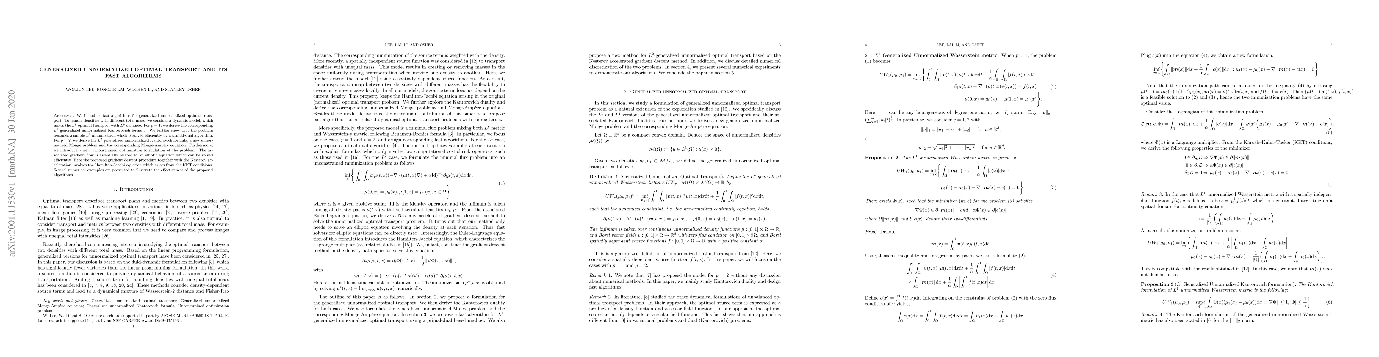 This research paper introduces fast algorithms for generalized unnormalized optimal transport, a problem that handles densities with different total mass, offering new solutions like $L^1$ minimization and Monge-Amp\