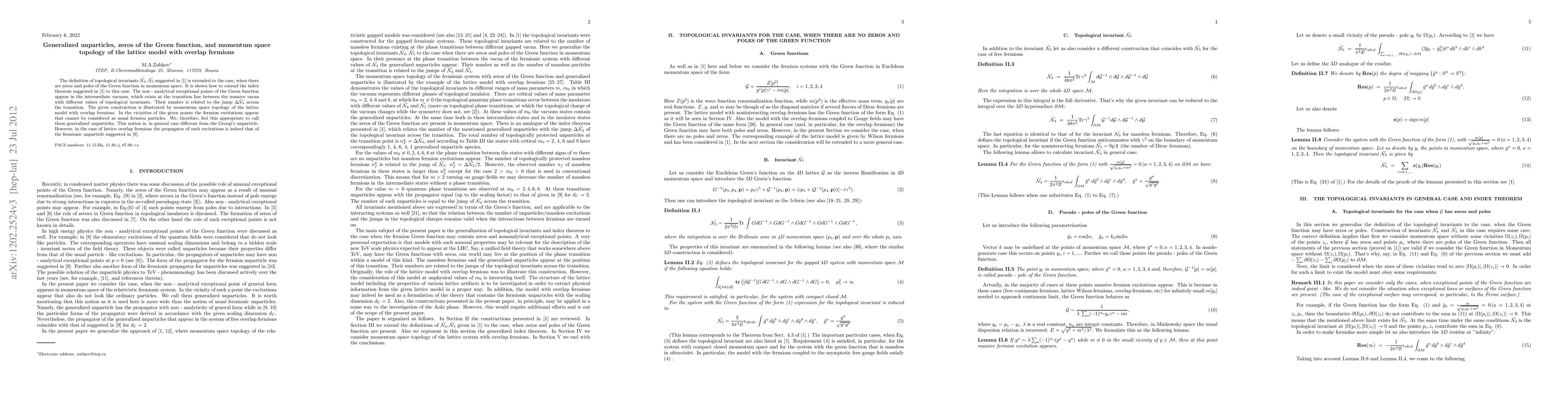 The definition of topological invariants $\tilde{\cal N}_4, \tilde{\cal N}_5$ suggested in \cite{VZ2012} is extended to the case, when there are zeros and poles of the Green function in momentum space. It is shown how to extend the index theorem suggested in \cite{VZ2012} to this case. The non - analytical exceptional points of the Green function appear in the intermediate vacuum, which exists at the transition line between the massive vacua with different values of topological invariants. Their number is related to the jump $\Delta\tilde{\cal N}_4$ across the transition. The given construction is illustrated by momentum space topology of the lattice model with overlap fermions. In the vicinities of the given points the fermion excitations appear that cannot be considered as usual fermion particles. We, therefore, feel this appropriate to call them generalized unparticles. This notion is, in general case different from the Georgi's unparticle. However, in the case of lattice overlap fermions the propagator of such excitations is indeed that of the fermionic unparticle suggested in \cite{fermion_unparticle}.