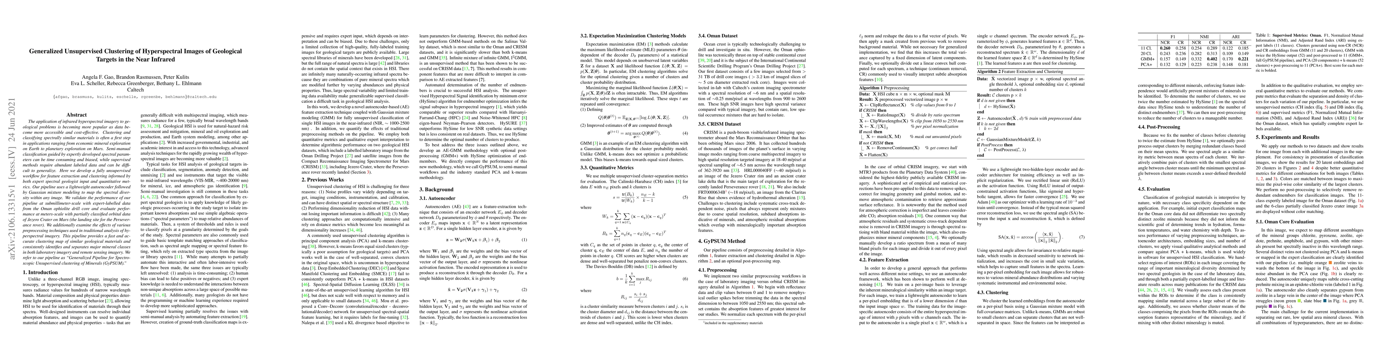 A new unsupervised clustering pipeline for hyperspectral images of geological targets is developed, outperforming traditional methods in accuracy and speed, with potential applications in mineral exploration and planetary science.