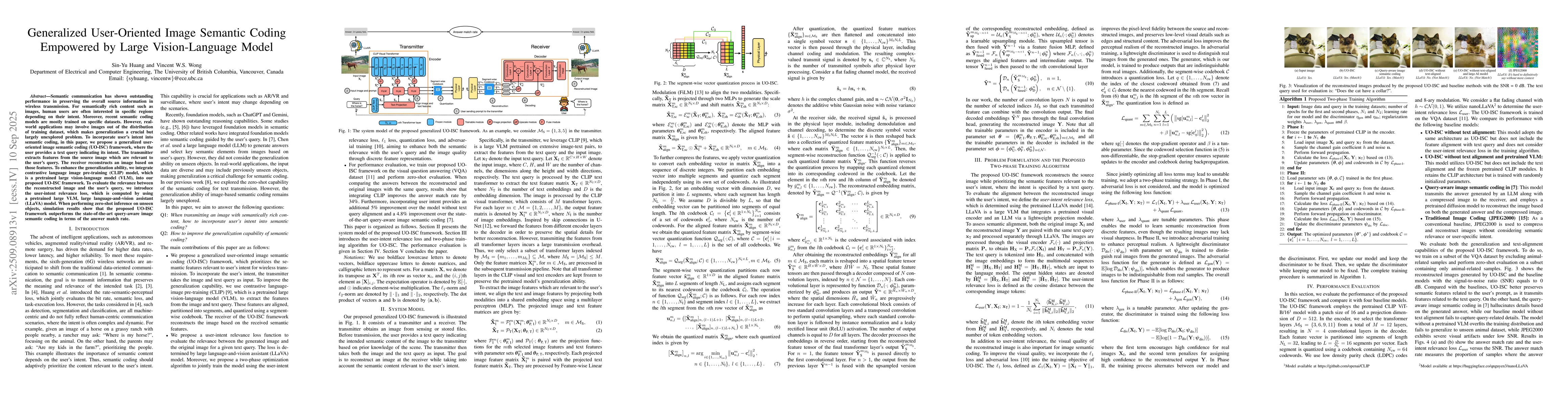 Semantic communication has shown outstanding performance in preserving the overall source information in wireless transmission. For semantically rich content such as images, human users are often interested in specific regions depending on their intent. Moreover, recent semantic coding models are mostly trained on specific datasets. However, real-world applications may involve images out of the distribution of training dataset, which makes generalization a crucial but largely unexplored problem. To incorporate user's intent into semantic coding, in this paper, we propose a generalized user-oriented image semantic coding (UO-ISC) framework, where the user provides a text query indicating its intent. The transmitter extracts features from the source image which are relevant to the user's query. The receiver reconstructs an image based on those features. To enhance the generalization ability, we integrate contrastive language image pre-training (CLIP) model, which is a pretrained large vision-language model (VLM), into our proposed UO-ISC framework. To evaluate the relevance between the reconstructed image and the user's query, we introduce the user-intent relevance loss, which is computed by using a pretrained large VLM, large language-and-vision assistant (LLaVA) model. When performing zero-shot inference on unseen objects, simulation results show that the proposed UO-ISC framework outperforms the state-of-the-art query-aware image semantic coding in terms of the answer match rate.