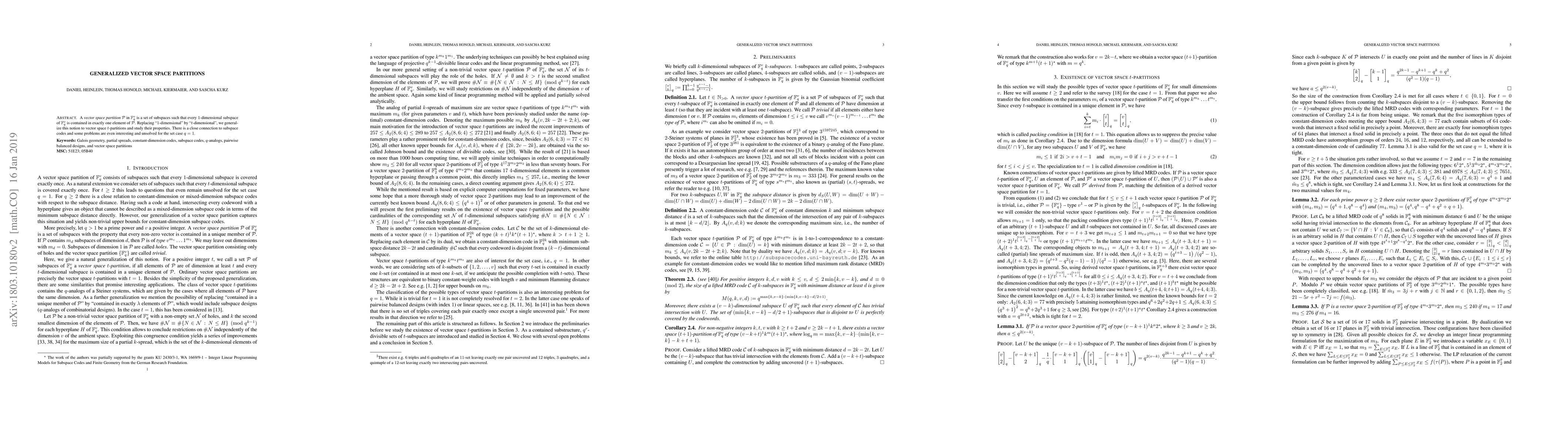 This paper explores generalized vector space partitions, specifically $t$-partitions where every $t$-dimensional subspace in $\mathbb{F}_q^v$ is contained in exactly one subspace. It investigates their properties and connections to subspace codes, highlighting unsolved problems even in the simplest case of $q=1$.