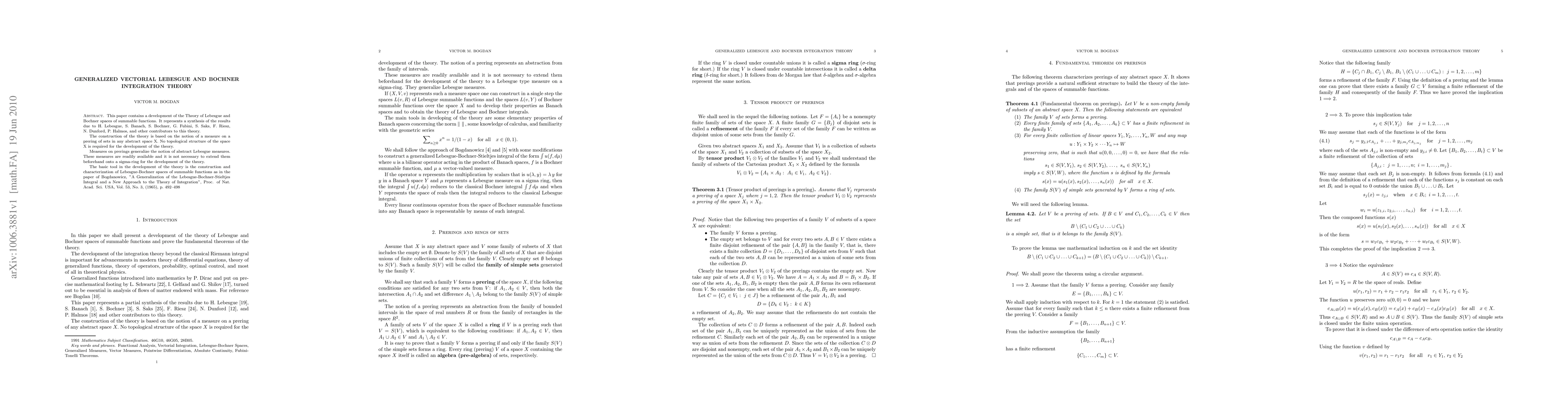 This paper contains a development of the Theory of Lebesgue and Bochner spaces of summable functions. It represents a synthesis of the results due to H. Lebesgue, S. Banach, S. Bochner, G. Fubini, S. Saks, F. Riesz, N. Dunford, P. Halmos, and other contributors to this theory. The construction of the theory is based on the notion of a measure on a prering of sets in any abstract space X. No topological structure of the space X is required for the development of the theory. Measures on prerings generalize the notion of abstract Lebesgue measures. These measures are readily available and it is not necessary to extend them beforehand onto a sigma-ring for the development of the theory. The basic tool in the development of the theory is the construction and characterization of Lebesgue-Bochner spaces of summable functions as in the paper of Bogdanowicz, "A Generalization of the Lebesgue-Bochner-Stieltjes Integral and a New Approach to the Theory of Integration", Proc. of Nat. Acad. Sci. USA, Vol. 53, No. 3, (1965), p. 492--498