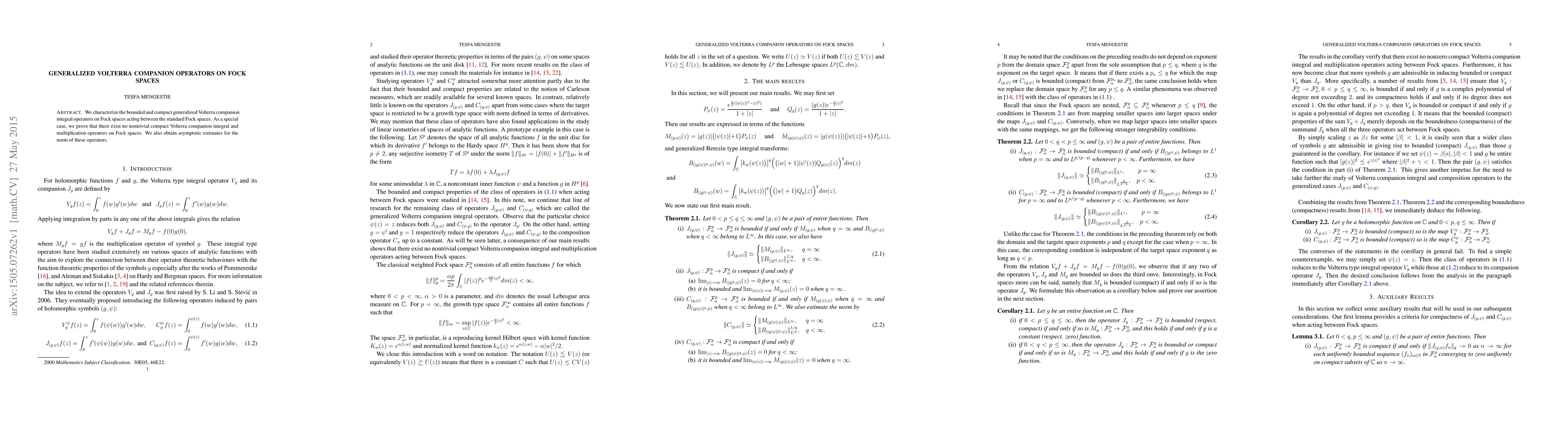 This paper characterizes bounded and compact generalized Volterra companion integral operators on Fock spaces, proving that no nontrivial compact Volterra companion integral or multiplication operators exist, and provides asymptotic estimates for the norm of these operators.