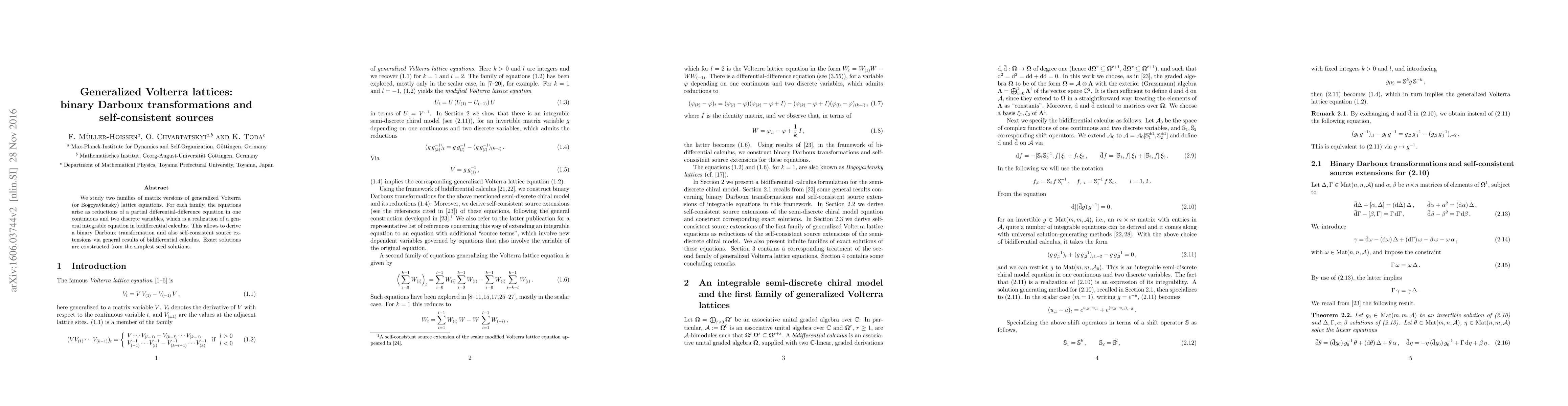 We study two families of (matrix versions of) generalized Volterra (or Bogoyavlensky) lattice equations. For each family, the equations arise as reductions of a partial differential-difference equation in one continuous and two discrete variables, which is a realization of a general integrable equation in bidifferential calculus. This allows to derive a binary Darboux transformation and also self-consistent source extensions via general results of bidifferential calculus. Exact solutions are constructed from the simplest seed solutions.