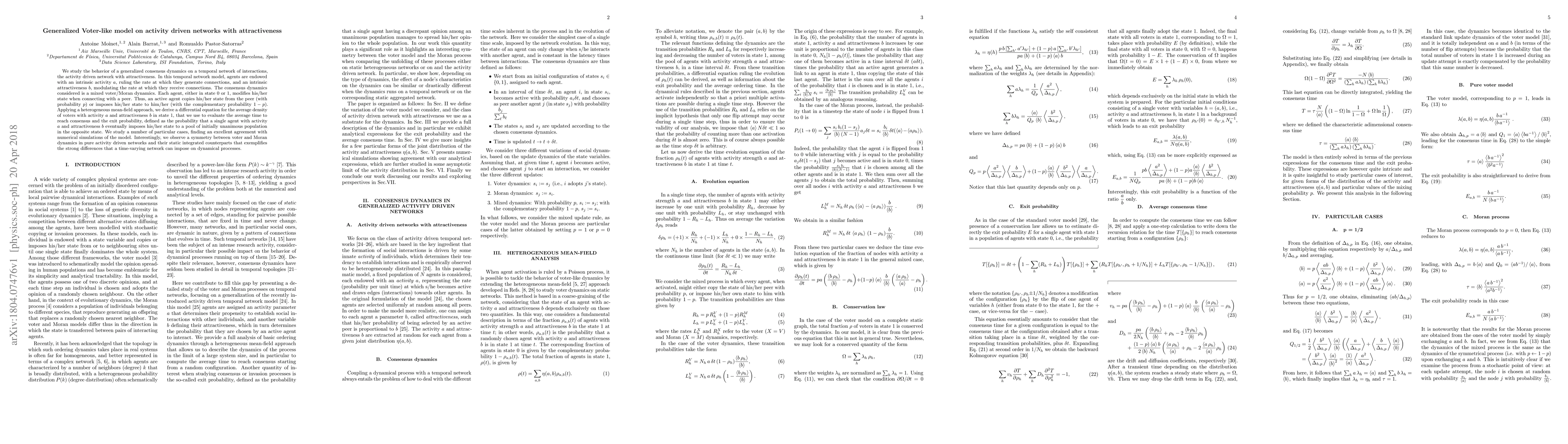This paper investigates a generalized consensus dynamics on activity-driven networks with attractiveness, where agents have intrinsic activity and attractiveness. The study combines voter and Moran dynamics, deriving a differential equation to evaluate consensus time and exit probability, revealing significant differences between dynamic and static networks.