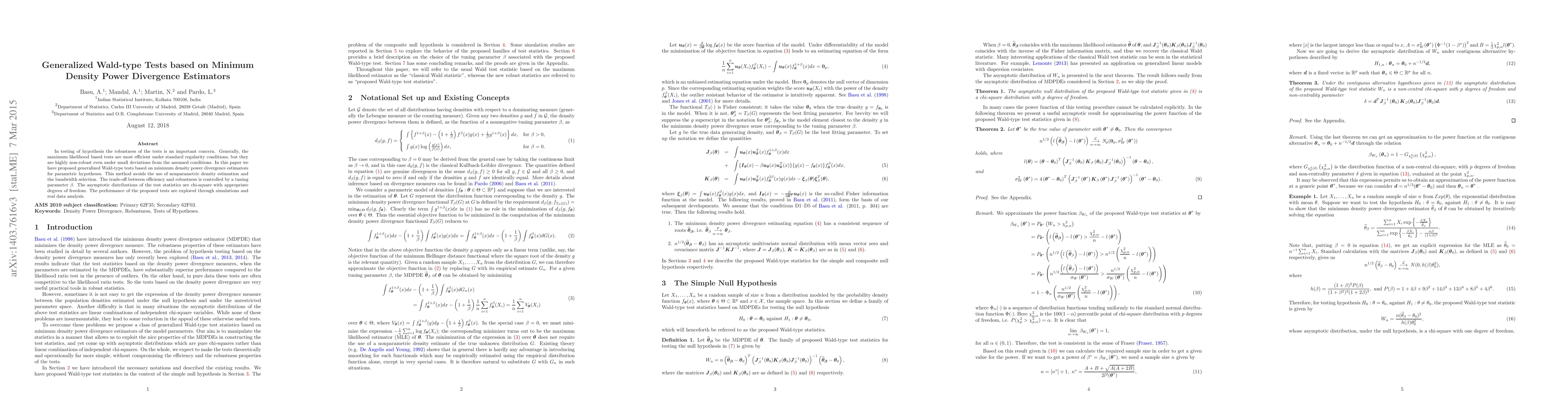 This paper proposes generalized Wald-type tests based on minimum density power divergence estimators for parametric hypotheses, aiming to improve robustness while maintaining efficiency. The method controls the trade-off between efficiency and robustness through a tuning parameter $\beta$, and the tests' asymptotic distributions are chi-square.