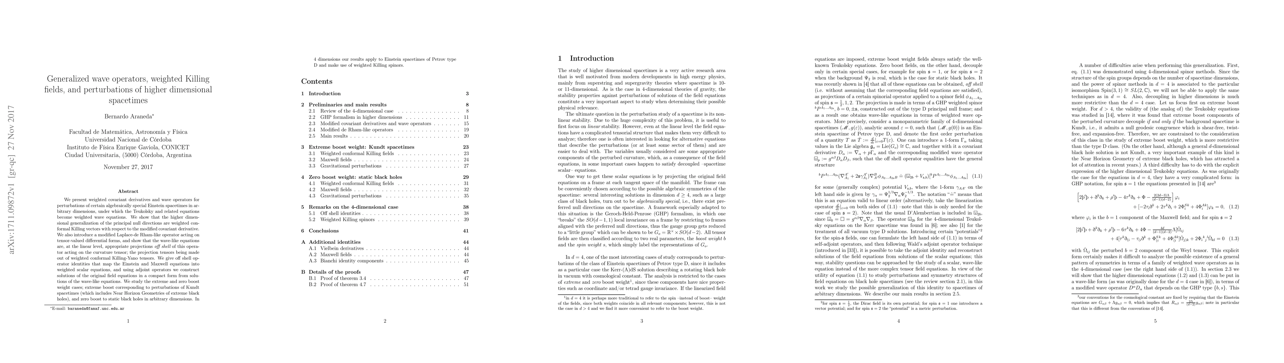 We present weighted covariant derivatives and wave operators for perturbations of certain algebraically special Einstein spacetimes in arbitrary dimensions, under which the Teukolsky and related equations become weighted wave equations. We show that the higher dimensional generalization of the principal null directions are weighted conformal Killing vectors with respect to the modified covariant derivative. We also introduce a modified Laplace-de Rham-like operator acting on tensor-valued differential forms, and show that the wave-like equations are, at the linear level, appropriate projections {\em off shell} of this operator acting on the curvature tensor; the projection tensors being made out of weighted conformal Killing-Yano tensors. We give off shell operator identities that map the Einstein and Maxwell equations into weighted scalar equations, and using adjoint operators we construct solutions of the original field equations in a compact form from solutions of the wave-like equations. We study the extreme and zero boost weight cases; extreme boost corresponding to perturbations of Kundt spacetimes (which includes Near Horizon Geometries of extreme black holes), and zero boost to static black holes in arbitrary dimensions. In 4 dimensions our results apply to Einstein spacetimes of Petrov type D and make use of weighted Killing spinors.