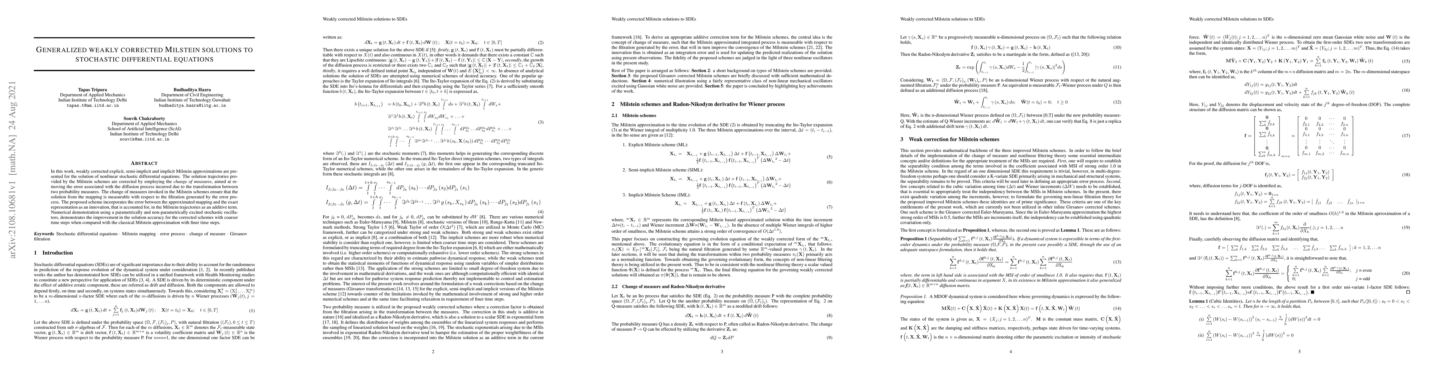 In this work, weakly corrected explicit, semi-implicit and implicit Milstein approximations are presented for the solution of nonlinear stochastic differential equations. The solution trajectories provided by the Milstein schemes are corrected by employing the \textit{change of measures}, aimed at removing the error associated with the diffusion process incurred due to the transformation between two probability measures. The change of measures invoked in the Milstein schemes ensure that the solution from the mapping is measurable with respect to the filtration generated by the error process. The proposed scheme incorporates the error between the approximated mapping and the exact representation as an innovation, that is accounted for, in the Milstein trajectories as an additive term. Numerical demonstration using a parametrically and non-parametrically excited stochastic oscillators, demonstrates the improvement in the solution accuracy for the corrected schemes with coarser time steps when compared with the classical Milstein approximation with finer time steps.