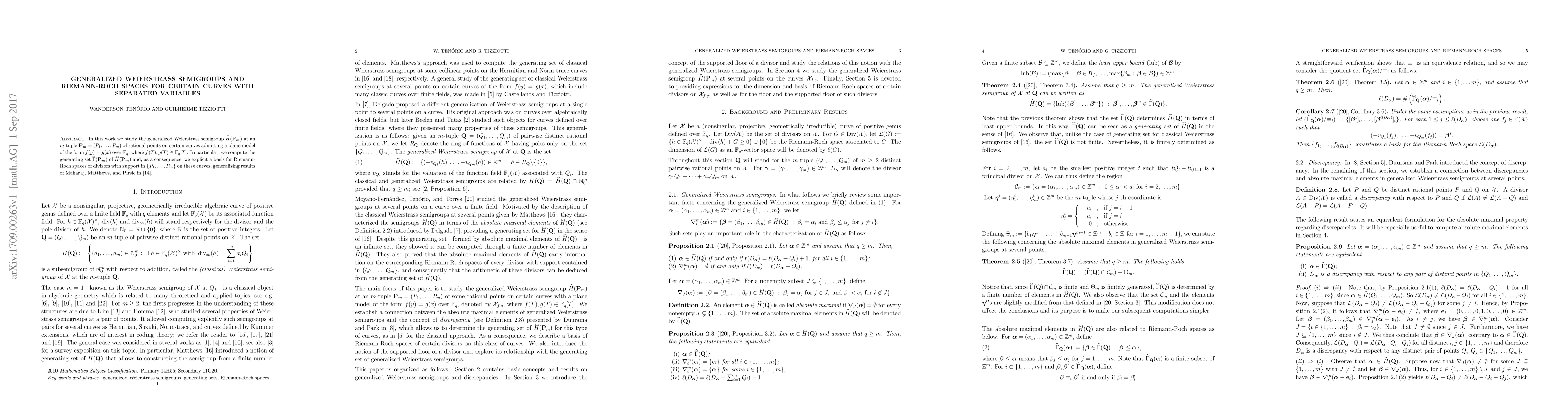 In this work we study the generalized Weierstrass semigroup $\widehat{H} (\mathbf{P}_m)$ at an $m$-tuple $\mathbf{P}_m = (P_{1}, \ldots , P_{m})$ of rational points on certain curves admitting a plane model of the form $f(y) = g(x)$ over $\mathbb{F}_{q}$, where ${f(T),g(T)\in \mathbb{F}_q[T]}$. In particular, we compute the generating set $\widehat{\Gamma}(\mathbf{P}_m)$ of $\widehat{H} (\mathbf{P}_m)$ and, as a consequence, we explicit a basis for Riemann-Roch spaces of divisors with support in $\{P_{1}, \ldots , P_{m}\}$ on these curves, generalizing results of Maharaj, Matthews, and Pirsic.