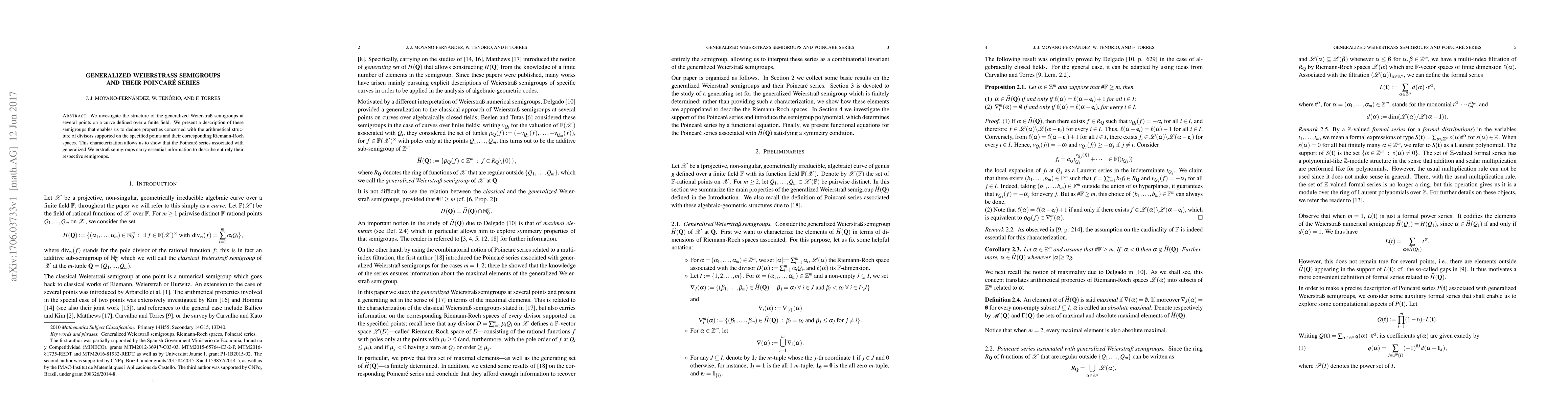 We investigate the structure of the generalized Weierstrass semigroups at several points on a curve defined over a finite field. We present a description of these semigroups that enables us to deduce properties concerned with the arithmetical structure of divisors supported on the specified points and their corresponding Riemann-Roch spaces. This characterization allows us to show that the Poincar\'e series associated with generalized Weierstrass semigroups carry essential information to describe entirely their respective semigroups.