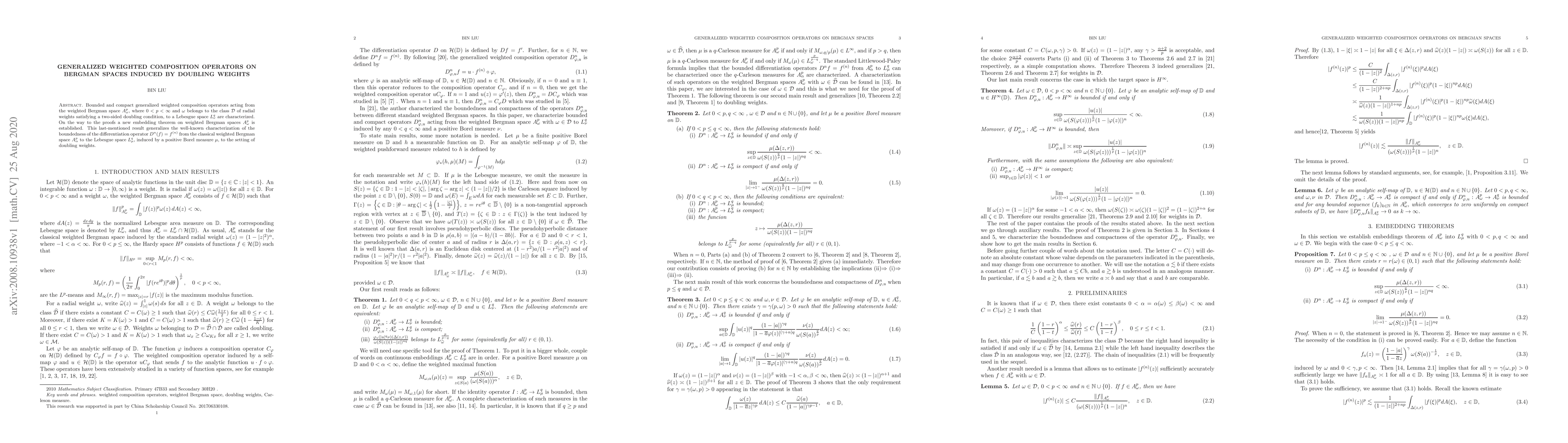 This paper characterizes bounded and compact generalized weighted composition operators from weighted Bergman spaces $A^p_\omega$ with doubling radial weights to Lebesgue spaces $L^q_\nu$. It also introduces a new embedding theorem that extends the characterization of differentiation operators from classical weighted Bergman spaces to Lebesgue spaces with doubling weights.