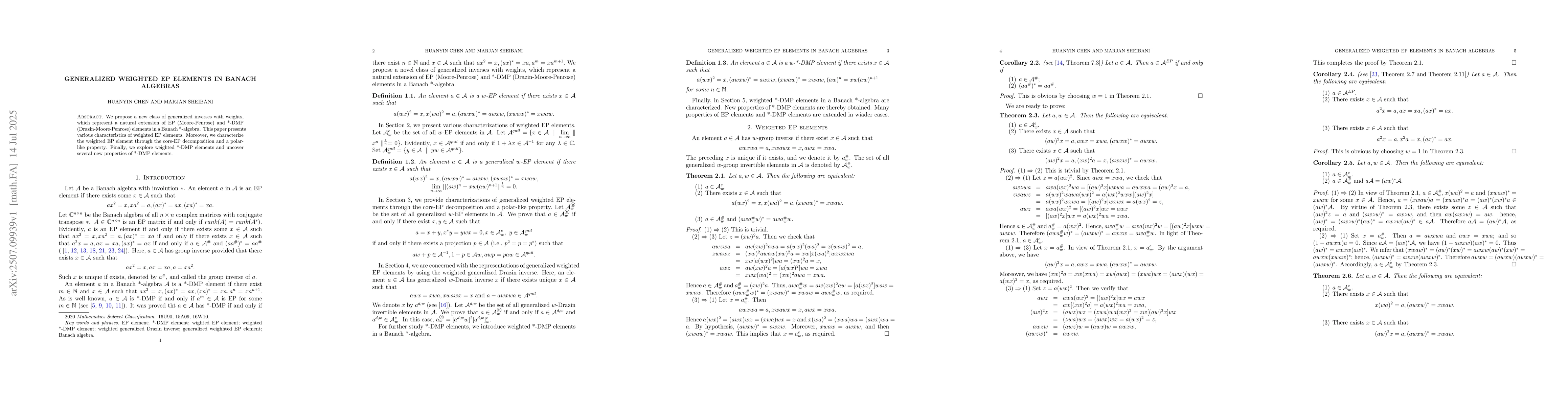 The paper introduces a new class of generalized inverses with weights in Banach *-algebras, extending EP and *-DMP elements.