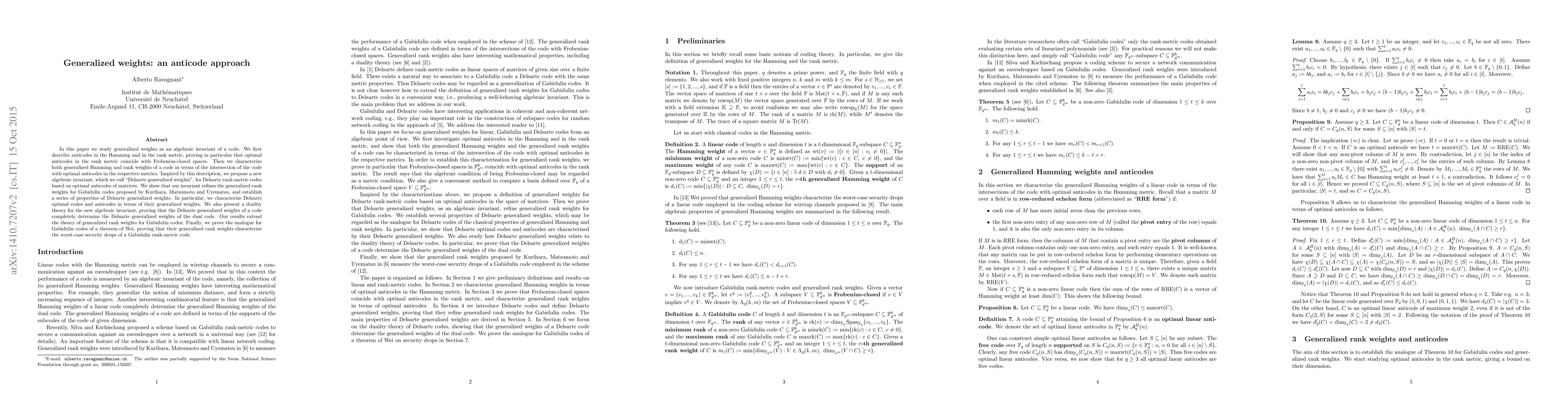 This paper introduces generalized weights as an algebraic invariant for codes, exploring anticodes in Hamming and rank metrics. It proposes Delsarte generalized weights for rank-metric codes, showing they refine existing generalized rank weights and establish properties, including a duality theory and security characterization.