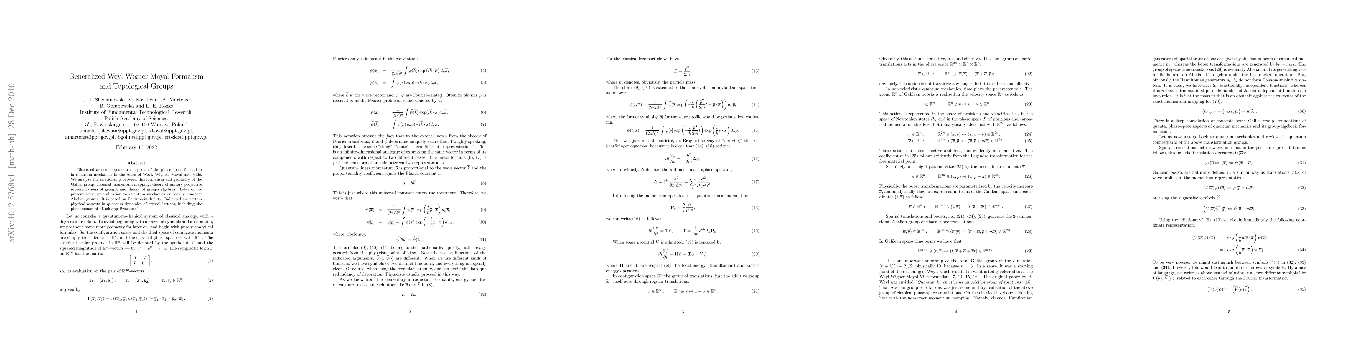 The paper explores the generalized Weyl-Wigner-Moyal formalism and its connection to topological groups, particularly focusing on the geometry of phase space and its relationship with the Galilei group. It also generalizes this formalism to quantum mechanics on locally compact Abelian groups, emphasizing physical phenomena such as "Umklapp-Prozessen" in crystal lattices.