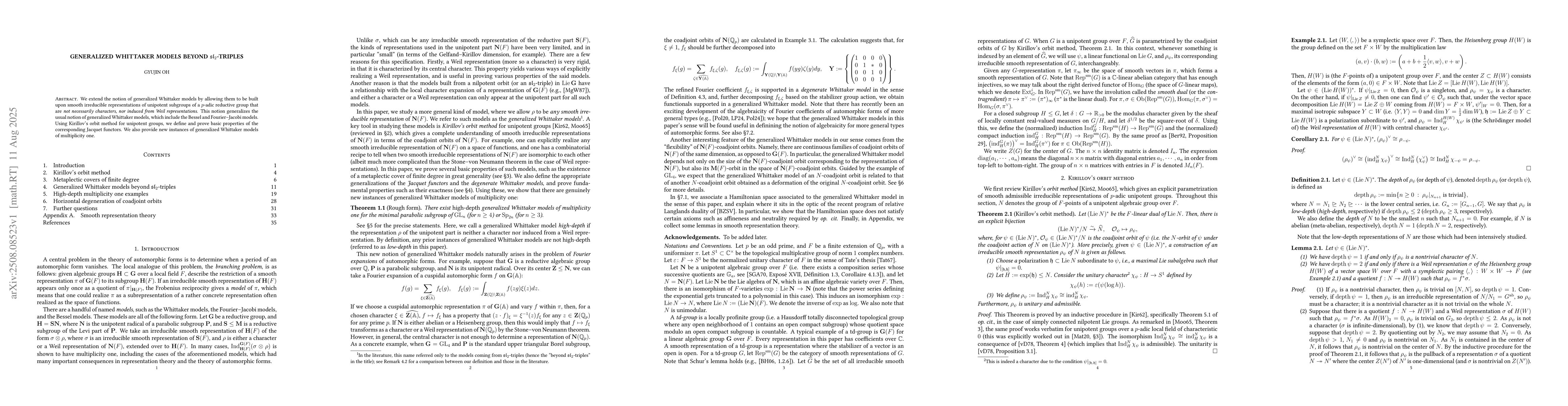 We extend the notion of generalized Whittaker models by allowing them to be built upon smooth irreducible representations of unipotent subgroups of a $p$-adic reductive group that are not necessarily characters, nor induced from Weil representations. This notion generalizes the usual notion of generalized Whittaker models, which include the Bessel and Fourier--Jacobi models. Using Kirillov's orbit method for unipotent groups, we define and prove basic properties of the corresponding Jacquet functors. We also provide new instances of generalized Whittaker models of multiplicity one.