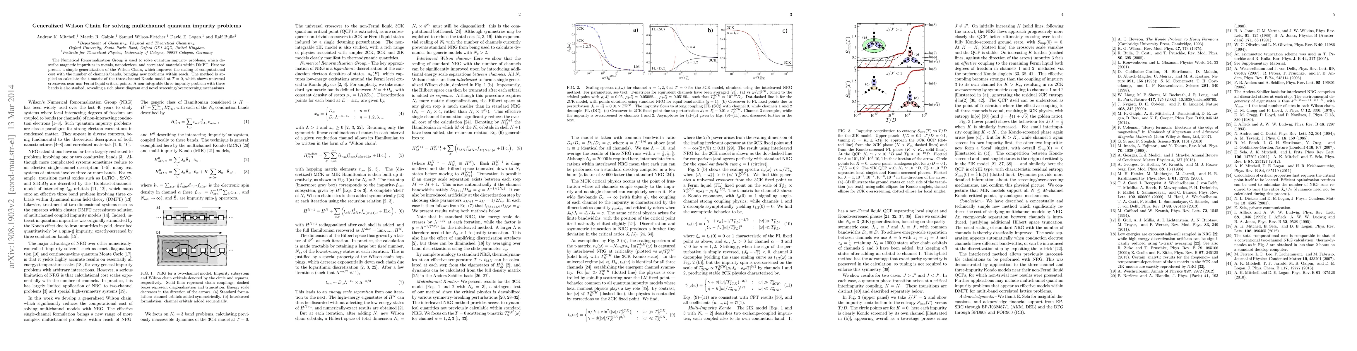 This paper presents a generalized Wilson Chain method to solve multichannel quantum impurity problems using the Numerical Renormalization Group within DMFT, improving computational efficiency. The method is demonstrated through calculations of the t-matrix for the three-channel Kondo model and a non-integrable three-impurity problem, revealing universal crossovers and novel screening mechanisms.
