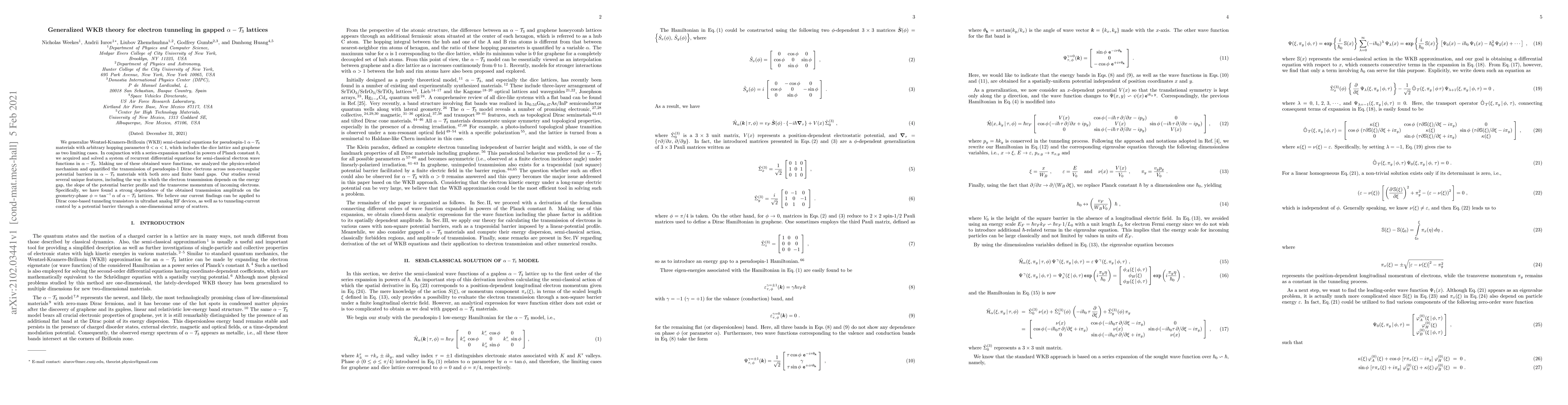This paper generalizes the Wentzel-Kramers-Brillouin (WKB) theory for electron tunneling in $\alpha-\mathcal{T}_3$ lattices, solving differential equations for semi-classical wave functions and analyzing pseudospin-1 electron transmission across potential barriers. The study reveals unique transmission features dependent on the energy gap, barrier profile, and electron momentum, with significant implications for Dirac cone-based devices and tunneling-current control.