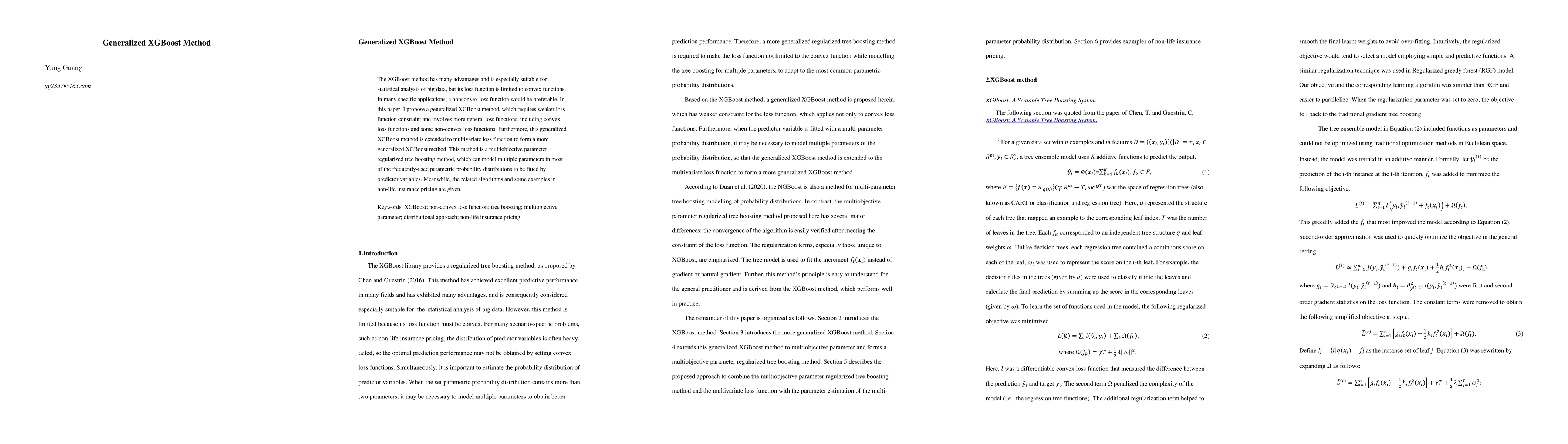 The XGBoost method has many advantages and is especially suitable for statistical analysis of big data, but its loss function is limited to convex functions. In many specific applications, a nonconvex loss function would be preferable. In this paper, I propose a generalized XGBoost method, which requires weaker loss function constraint and involves more general loss functions, including convex loss functions and some non-convex loss functions. Furthermore, this generalized XGBoost method is extended to multivariate loss function to form a more generalized XGBoost method. This method is a multiobjective parameter regularized tree boosting method, which can model multiple parameters in most of the frequently-used parametric probability distributions to be fitted by predictor variables. Meanwhile, the related algorithms and some examples in non-life insurance pricing are given.