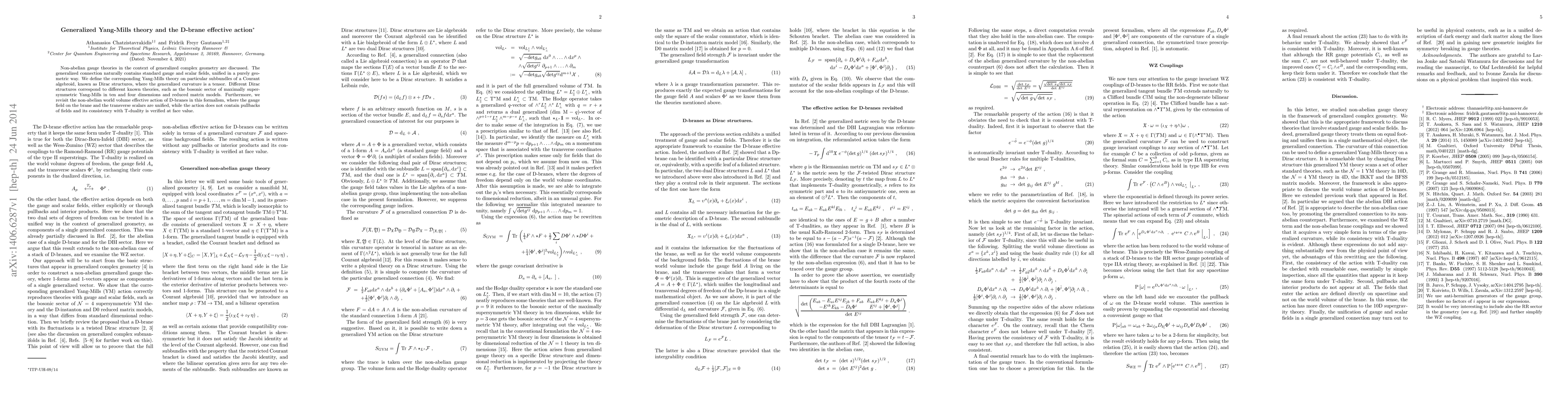 This paper explores non-abelian gauge theories within generalized complex geometry, defining a generalized Yang-Mills theory on Dirac structures of a Courant algebroid. It unifies gauge and scalar fields geometrically and revisits the D-brane effective action, ensuring consistency with T-duality.