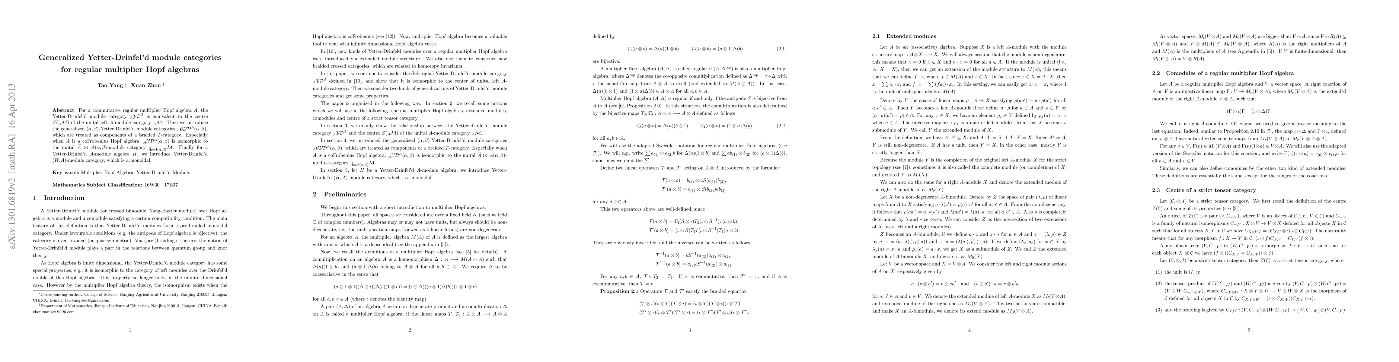 For a regular multiplier Hopf algebra $A$, the Yetter-Drinfel'd module category ${}_{A}\mathcal{YD}^{A}$ is equivalent to the centre $Z({}_{A}\mathcal{M})$ of the unital left $A$-module category ${}_{A}\mathcal{M}$. Then we introduce the generalized $(\alpha, \beta)$-Yetter-Drinfel'd module categories ${}_{A}\mathcal{GYD}^{A}(\alpha, \beta)$, which are treated as components of a braided $T$-category. Especially when $A$ is a coFrobenius Hopf algebra, ${}_{A}\mathcal{YD}^{A}(\alpha, \beta)$ is isomorphic to the unital $\hat{A} \bowtie A(\alpha, \beta)$-module category ${}_{\hat{A} \bowtie A(\alpha, \beta)}\mathcal{M}$. Finally for a Yetter-Drinfel'd $A$-module algebra $H$, we introduce Yetter-Drinfel'd $(H, A)$-module category, which is a monoidal.