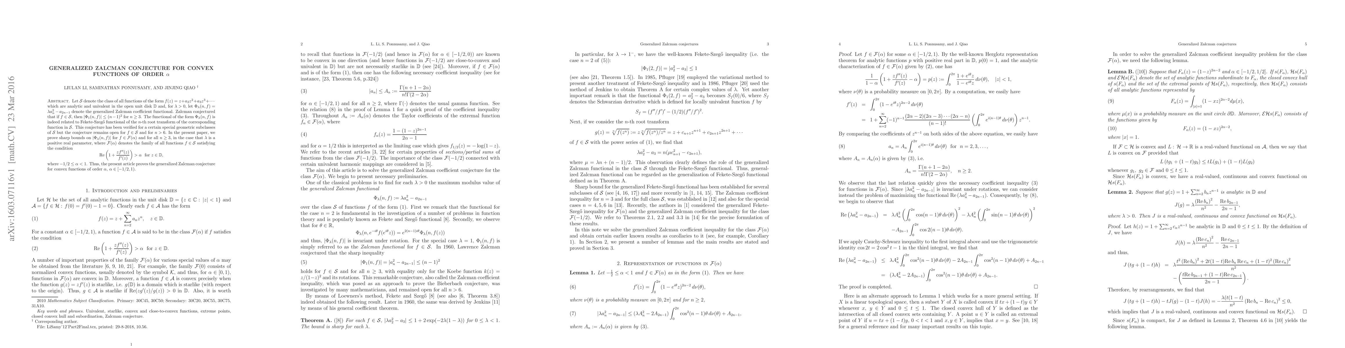Let $\mathcal S$ denote the class of all functions of the form $f(z)=z+a_2z^2+a_3z^3+\cdots$ which are analytic and univalent in the open unit disk $\ID$ and, for $\lambda >0$, let $\Phi_\lambda (n,f)=\lambda a_n^2-a_{2n-1}$ denote the generalized Zalcman coefficient functional. Zalcman conjectured that if $f\in \mathcal S$, then $|\Phi_1 (n,f)|\leq (n-1)^2$ for $n\ge 3$. The functional of the form $\Phi_\lambda (n,f)$ is indeed related to Fekete-Szeg\H{o} functional of the $n$-th root transform of the corresponding function in $\mathcal S$. This conjecture has been verified for a certain special geometric subclasses of $\mathcal S$ but the conjecture remains open for $f\in {\mathcal S}$ and for $n > 6$. In the present paper, we prove sharp bounds on $|\Phi_\lambda (n,f)|$ for $f\in \mathcal{F}(\alpha )$ and for all $n\geq 3$, in the case that $\lambda$ is a positive real parameter, where $ \mathcal{F}(\alpha )$ denotes the family of all functions $f\in {\mathcal S}$ satisfying the condition $${\rm Re } \left( 1+\frac{zf''(z)}{f'(z)}\right) > \alpha ~\mbox{ for $z\in \ID$}, $$ where $-1/2\leq \alpha <1$. Thus, the present article proves the generalized Zalcman conjecture for convex functions of order $\alpha$, $\alpha \in [-1/2,1)$.