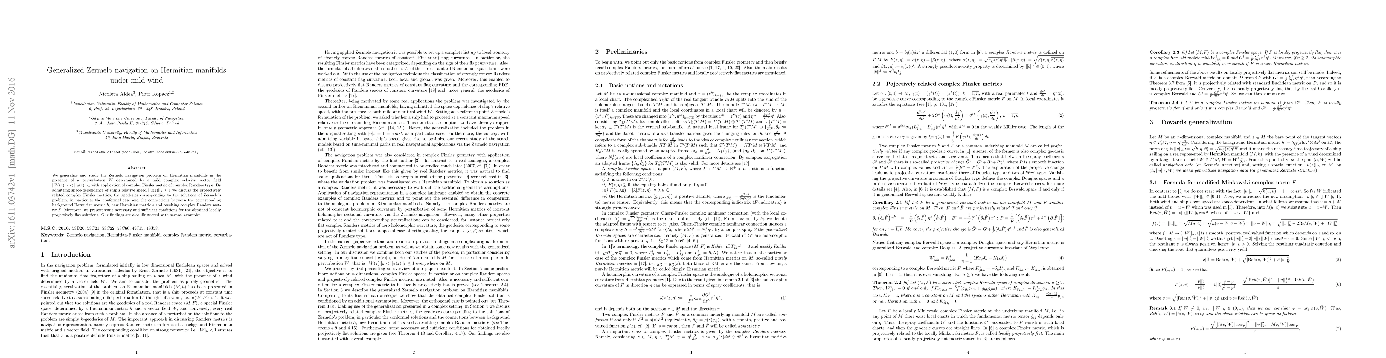 We generalize and study the Zermelo navigation problem on Hermitian manifolds in the presence of a perturbation $W$ determined by a mild complex velocity vector field $||W(z)||_h<||u(z)||_h$, with application of complex Finsler metric of complex Randers type. By admitting space-dependence of ship's relative speed $||u(z)||_h\leq1$ we discuss the projectively related complex Finsler metrics, the geodesics corresponding to the solutions of Zermelo's problem, in particular the conformal case and the connections between the corresponding background Hermitian metric $h$, new Hermitian metric $a$ and resulting complex Randers metric $F$. Moreover, we present some necessary and sufficient conditions for the obtained locally projectively flat solutions. Our findings are also illustrated with several examples.