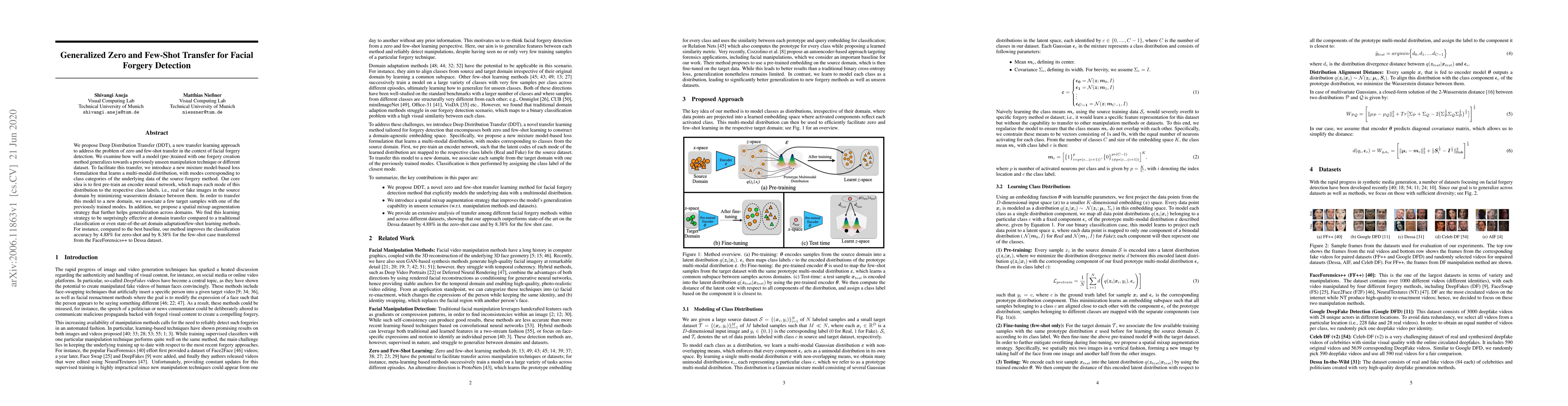 The paper introduces Deep Distribution Transfer (DDT), a novel transfer learning method for zero and few-shot facial forgery detection, achieving significant improvements over baselines by employing a mixture model-based loss and spatial mixup augmentation. The method pre-trains an encoder to map multi-modal distributions to class labels, enhancing domain transfer performance.