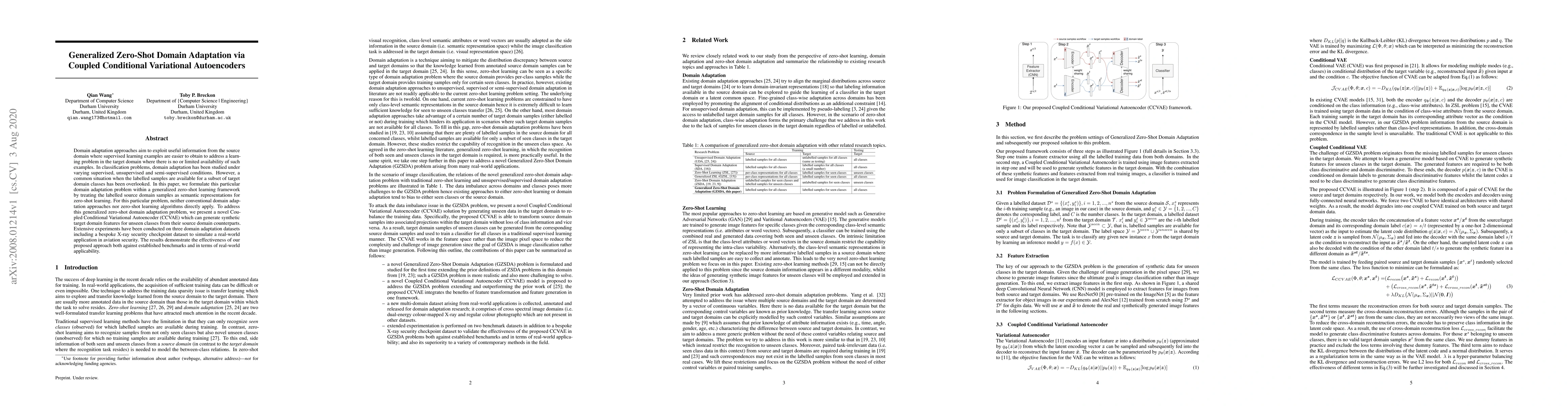 This paper proposes a novel Coupled Conditional Variational Autoencoder (CCVAE) to tackle generalized zero-shot domain adaptation, generating synthetic target domain features for unseen classes from source domain samples. Experiments on multiple datasets, including a bespoke aviation security dataset, show the effectiveness of the approach.