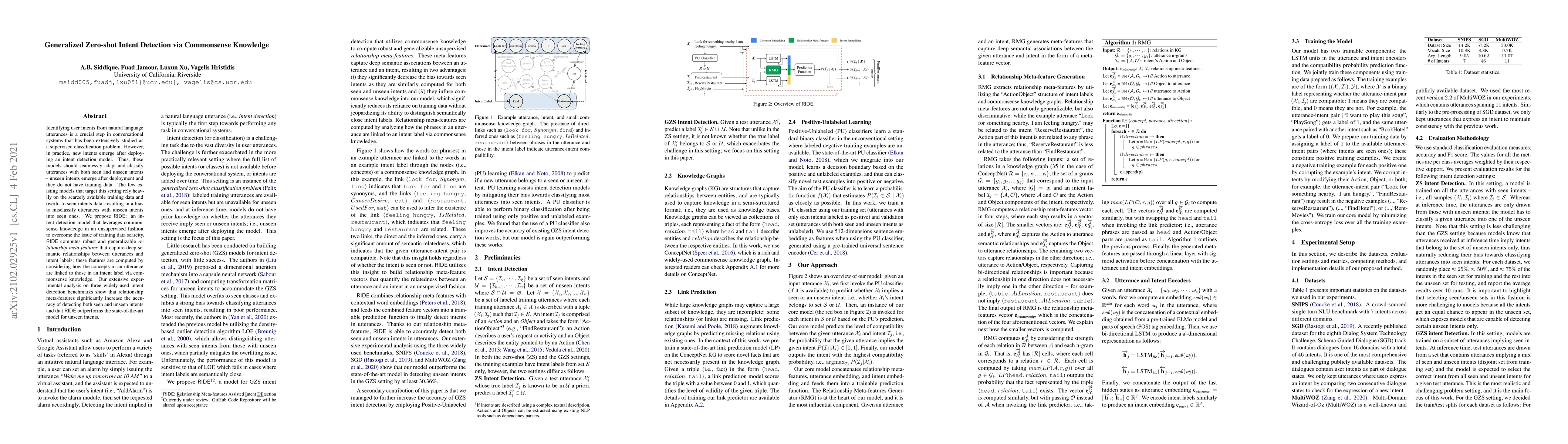 The paper proposes RIDE, an intent detection model that uses commonsense knowledge to identify user intents in conversational systems, even for unseen intents that lack training data. RIDE leverages relationship meta-features derived from commonsense to improve accuracy and outperforms existing models on benchmarks.