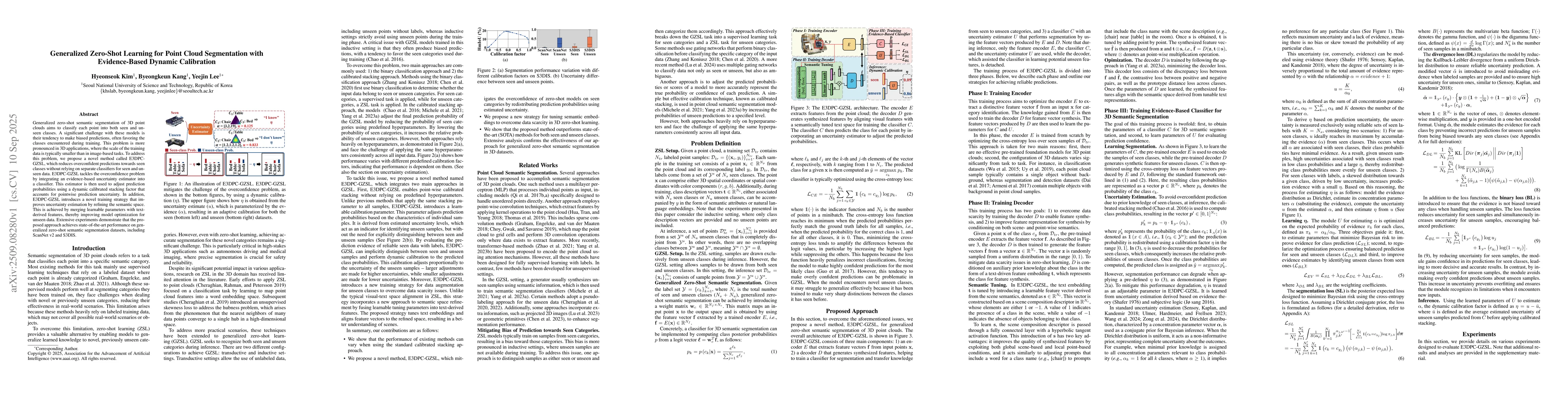 Generalized zero-shot semantic segmentation of 3D point clouds aims to classify each point into both seen and unseen classes. A significant challenge with these models is their tendency to make biased predictions, often favoring the classes encountered during training. This problem is more pronounced in 3D applications, where the scale of the training data is typically smaller than in image-based tasks. To address this problem, we propose a novel method called E3DPC-GZSL, which reduces overconfident predictions towards seen classes without relying on separate classifiers for seen and unseen data. E3DPC-GZSL tackles the overconfidence problem by integrating an evidence-based uncertainty estimator into a classifier. This estimator is then used to adjust prediction probabilities using a dynamic calibrated stacking factor that accounts for pointwise prediction uncertainty. In addition, E3DPC-GZSL introduces a novel training strategy that improves uncertainty estimation by refining the semantic space. This is achieved by merging learnable parameters with text-derived features, thereby improving model optimization for unseen data. Extensive experiments demonstrate that the proposed approach achieves state-of-the-art performance on generalized zero-shot semantic segmentation datasets, including ScanNet v2 and S3DIS.