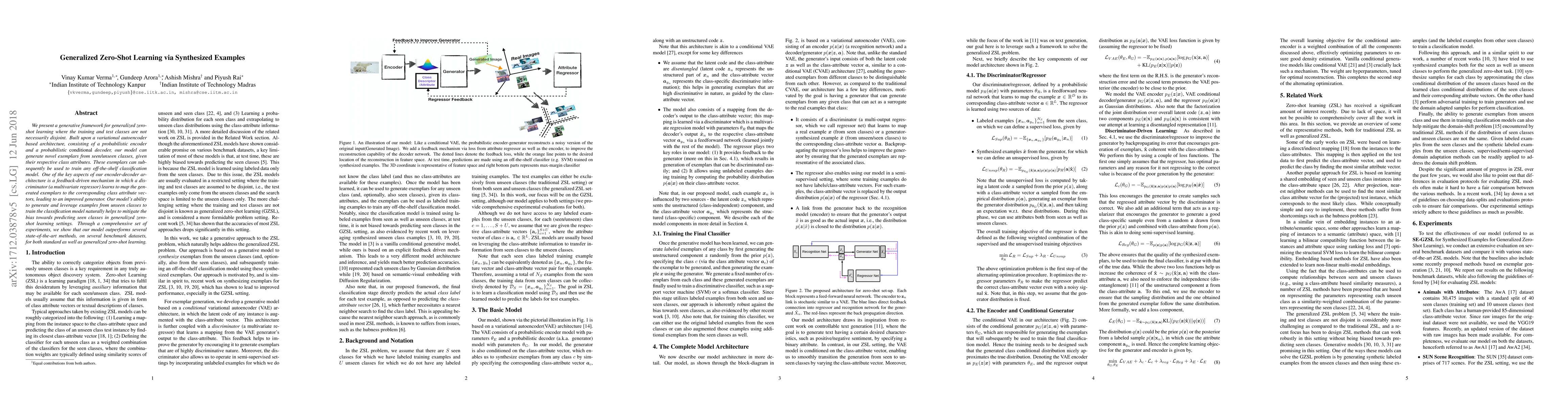 The paper proposes a generative framework for generalized zero-shot learning using a variational autoencoder (VAE) based architecture with a probabilistic encoder and a probabilistic conditional decoder. This model generates novel exemplars from seen/unseen classes based on their class attributes, which can then be used to train any off-the-shelf classification model. A feedback-driven mechanism involving a discriminator (multivariate regressor) improves the generator by mapping generated exemplars to the corresponding class attribute vectors.