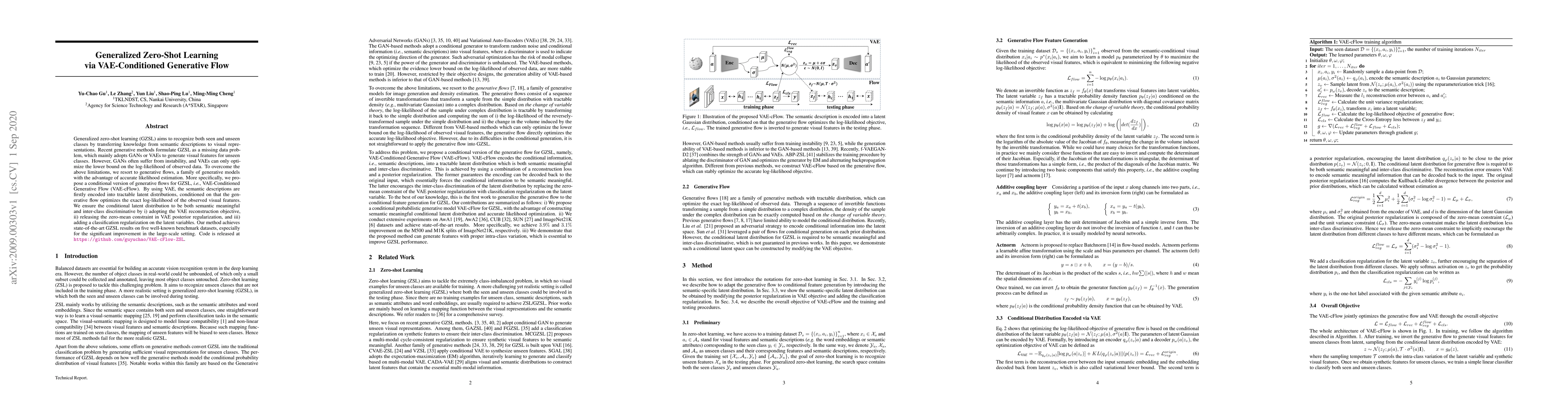 This paper proposes VAE-Conditioned Generative Flow (VAE-cFlow) for generalized zero-shot learning, leveraging generative flows for accurate likelihood estimation and overcoming limitations of GANs and VAEs. The method encodes semantic descriptions into latent distributions and optimizes the exact log-likelihood of visual features, achieving state-of-the-art results on multiple datasets.