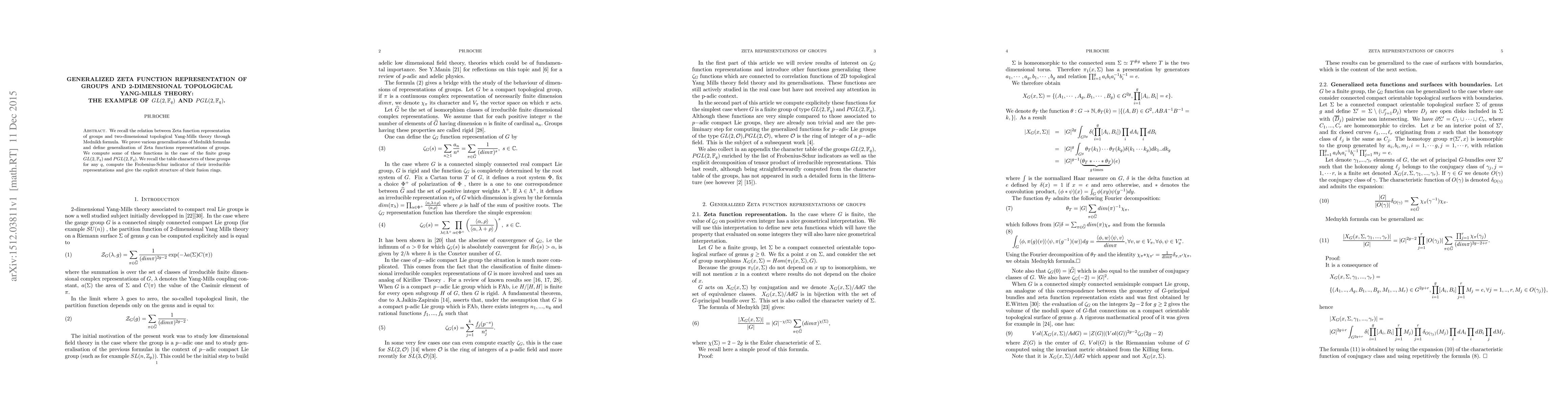 We recall the relation between Zeta function representation of groups and two-dimensional topological Yang-Mills theory through Mednikh formula. We prove various generalisations of Mednikh formulas and define generalization of Zeta functions representations of groups. We compute some of these functions in the case of the finite group $GL(2, {\mathbb F}_q)$ and $PGL(2,{\mathbb F}_q).$ We recall the table characters of these groups for any $q$, compute the Frobenius-Schur indicator of their irreducible representations and give the explicit structure of their fusion rings