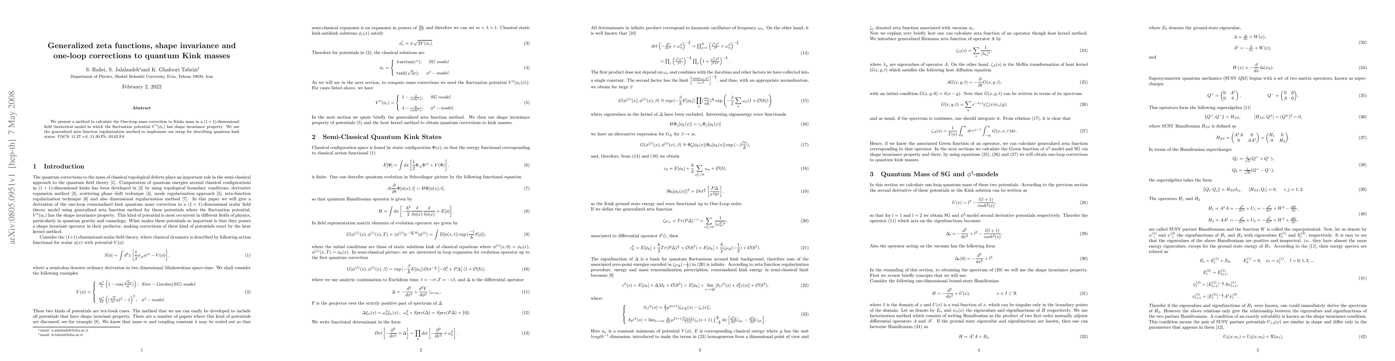 We present a method to calculate the One-loop mass correction to Kinks mass in a (1+1)-dimensional field theoretical model in which the fluctuation potential $V^{\prime\prime}(\phi_c)$ has shape invariance property. We use the generalized zeta function regularization method to implement our setup for describing quantum kink states.