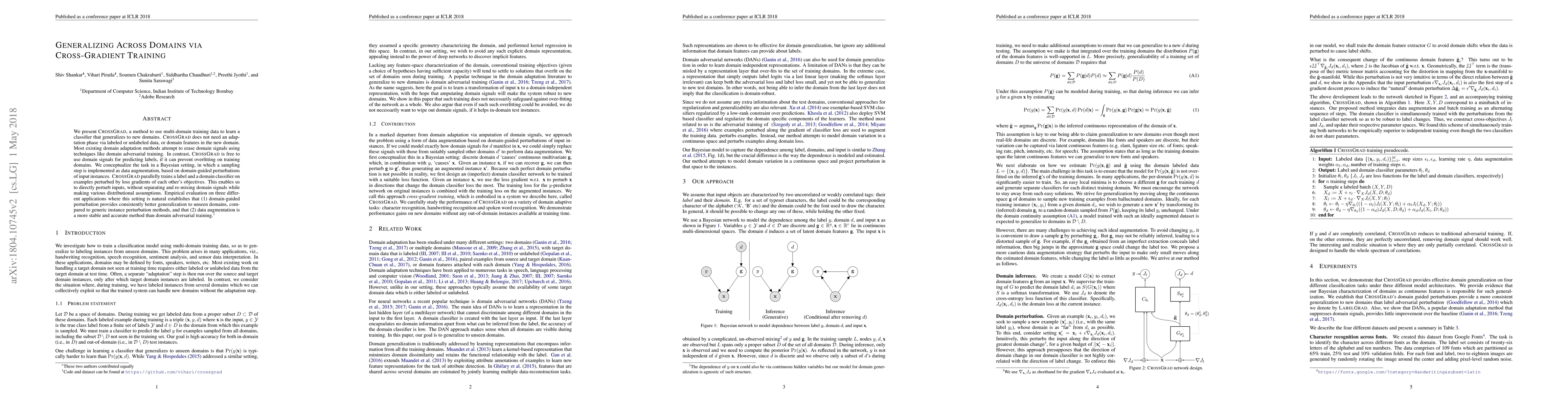 CROSSGRAD learns a classifier that generalizes to new domains without requiring adaptation data or domain features, achieving better performance than generic instance perturbation methods and traditional domain adversarial training.