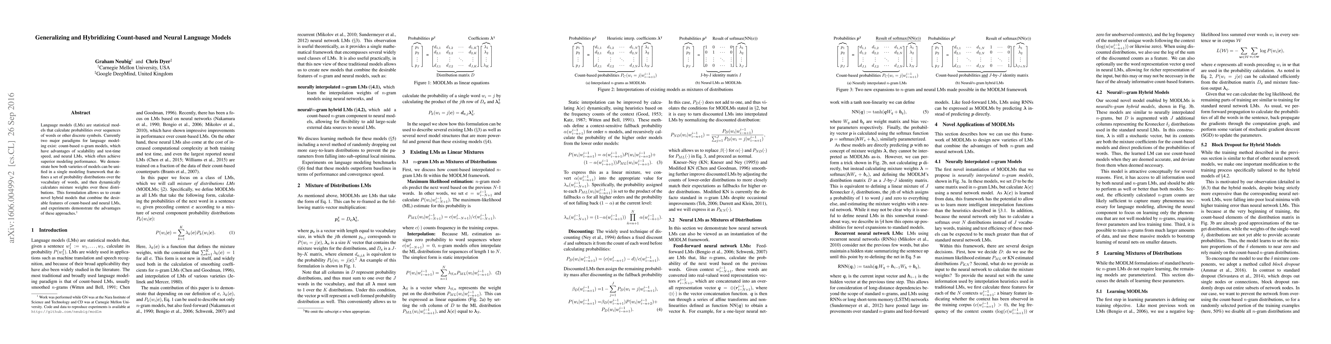 Language models (LMs) are statistical models that calculate probabilities over sequences of words or other discrete symbols. Currently two major paradigms for language modeling exist: count-based n-gram models, which have advantages of scalability and test-time speed, and neural LMs, which often achieve superior modeling performance. We demonstrate how both varieties of models can be unified in a single modeling framework that defines a set of probability distributions over the vocabulary of words, and then dynamically calculates mixture weights over these distributions. This formulation allows us to create novel hybrid models that combine the desirable features of count-based and neural LMs, and experiments demonstrate the advantages of these approaches.