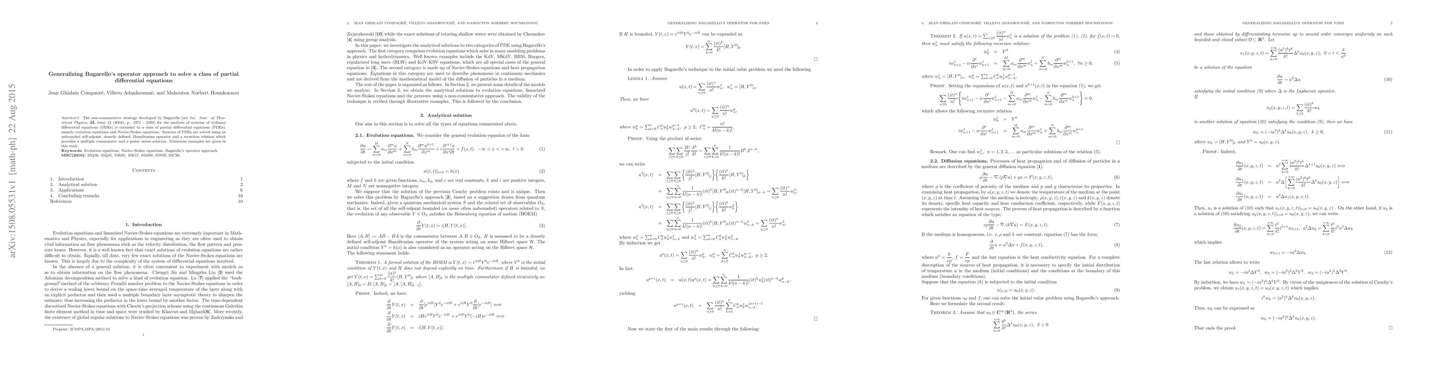 This paper extends Bagarello's non-commutative operator method, originally for ordinary differential equations, to solve a class of partial differential equations, including evolution and Navier-Stokes equations, using an unbounded self-adjoint Hamiltonian operator and a recursion relation for multiple commutator and power series solutions. Numerous examples are provided to demonstrate the method's effectiveness.