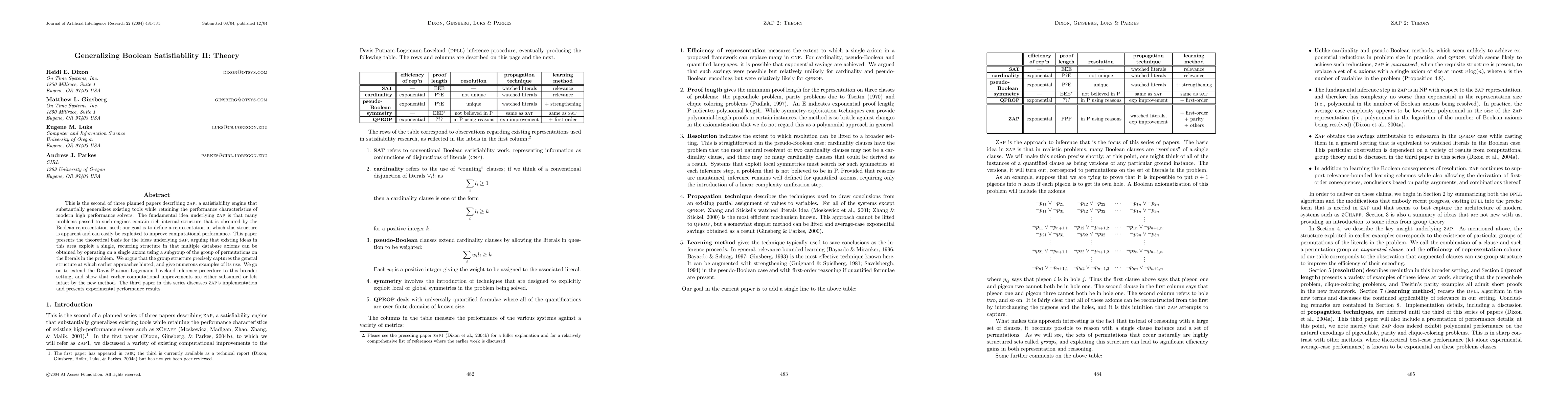 This is the second of three planned papers describing ZAP, a satisfiability engine that substantially generalizes existing tools while retaining the performance characteristics of modern high performance solvers. The fundamental idea underlying ZAP is that many problems passed to such engines contain rich internal structure that is obscured by the Boolean representation used; our goal is to define a representation in which this structure is apparent and can easily be exploited to improve computational performance. This paper presents the theoretical basis for the ideas underlying ZAP, arguing that existing ideas in this area exploit a single, recurring structure in that multiple database axioms can be obtained by operating on a single axiom using a subgroup of the group of permutations on the literals in the problem. We argue that the group structure precisely captures the general structure at which earlier approaches hinted, and give numerous examples of its use. We go on to extend the Davis-Putnam-Logemann-Loveland inference procedure to this broader setting, and show that earlier computational improvements are either subsumed or left intact by the new method. The third paper in this series discusses ZAPs implementation and presents experimental performance results.