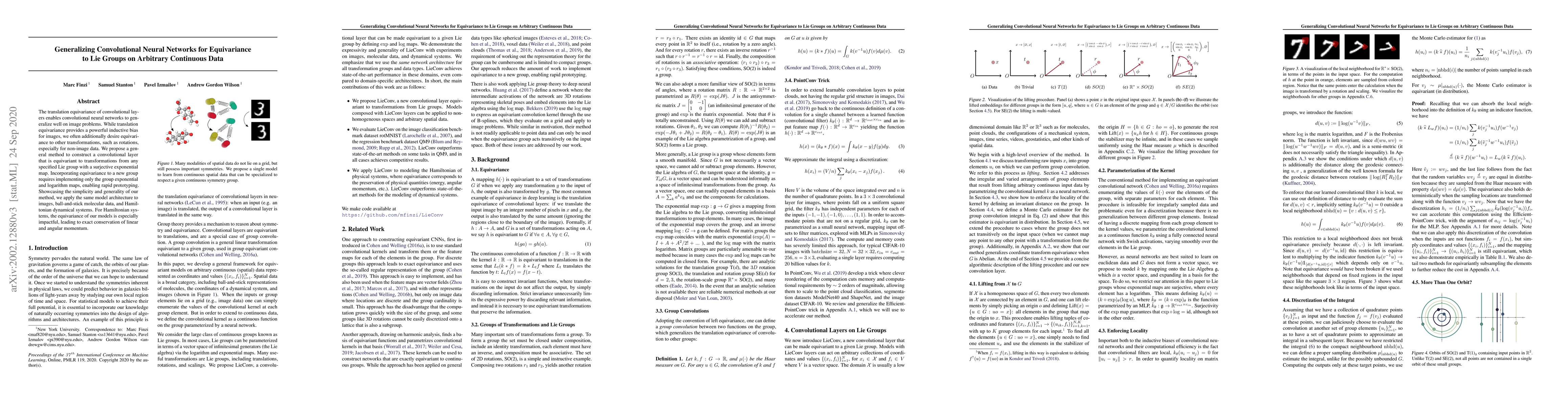 The translation equivariance of convolutional layers enables convolutional neural networks to generalize well on image problems. While translation equivariance provides a powerful inductive bias for images, we often additionally desire equivariance to other transformations, such as rotations, especially for non-image data. We propose a general method to construct a convolutional layer that is equivariant to transformations from any specified Lie group with a surjective exponential map. Incorporating equivariance to a new group requires implementing only the group exponential and logarithm maps, enabling rapid prototyping. Showcasing the simplicity and generality of our method, we apply the same model architecture to images, ball-and-stick molecular data, and Hamiltonian dynamical systems. For Hamiltonian systems, the equivariance of our models is especially impactful, leading to exact conservation of linear and angular momentum.
