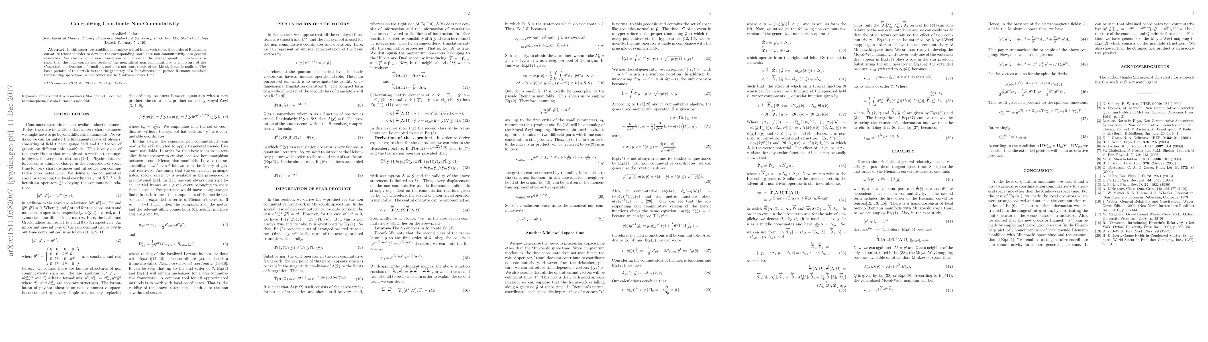 In this paper, we establish and employ a local framework to the first order of Riemann's curvature tensor in order to develop the corresponding coordinate non commutativity into general manifolds. We also exploit a new translation of function at the level of quantum mechanics to show that the final correlation result of the generalized non commutativity is a mixture of the Canonical and Quadratic formalisms and does not consist only of the Lie algebraic formalism. The basic premise of this article is that the geometry of a four-dimensional pseudo Riemann manifold representing space time, is homeomorphic to Minkowski space time.