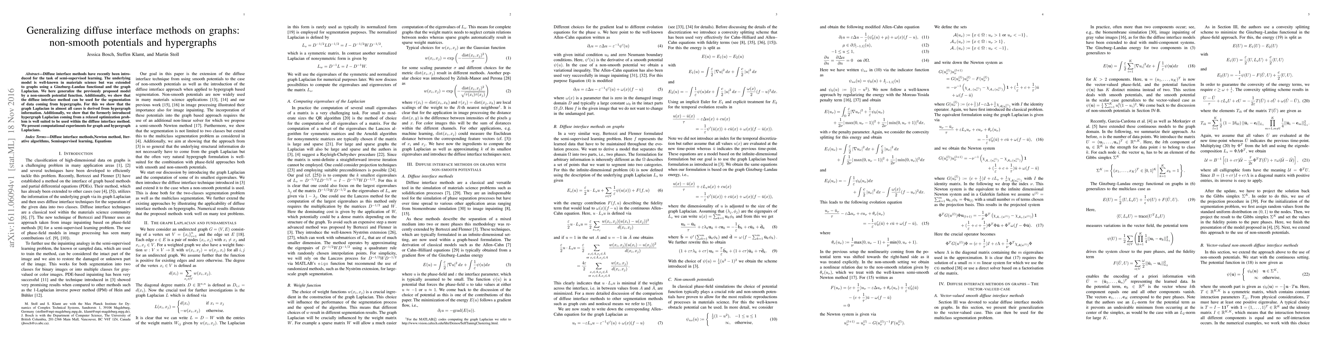 Diffuse interface methods have recently been introduced for the task of semi-supervised learning. The underlying model is well-known in materials science but was extended to graphs using a Ginzburg--Landau functional and the graph Laplacian. We here generalize the previously proposed model by a non-smooth potential function. Additionally, we show that the diffuse interface method can be used for the segmentation of data coming from hypergraphs. For this we show that the graph Laplacian in almost all cases is derived from hypergraph information. Additionally, we show that the formerly introduced hypergraph Laplacian coming from a relaxed optimization problem is well suited to be used within the diffuse interface method. We present computational experiments for graph and hypergraph Laplacians.