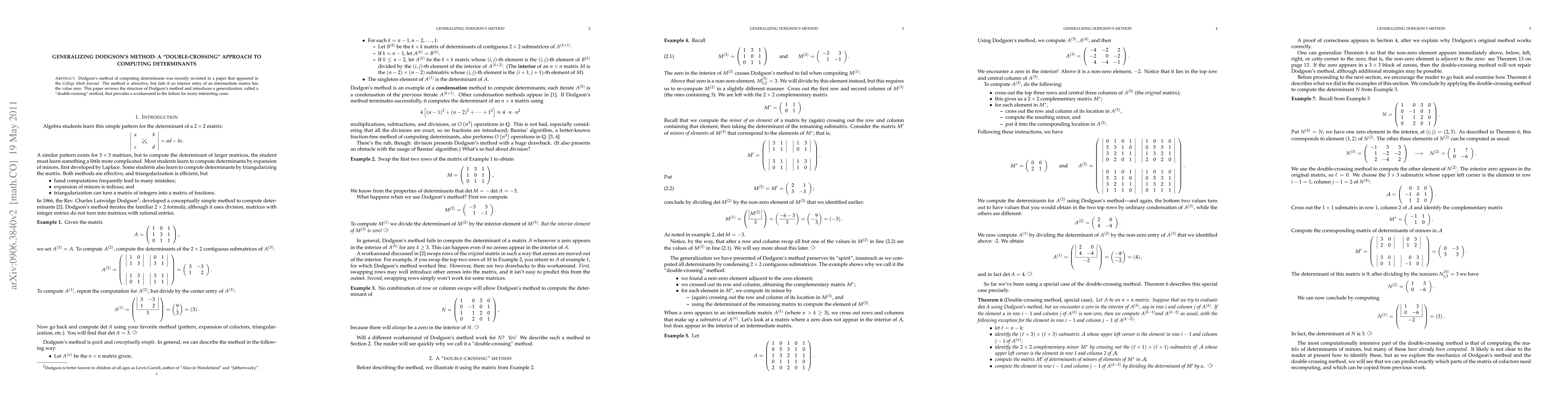 This paper generalizes Dodgson's method for computing determinants, addressing its failure when intermediate matrices contain zero entries. The proposed "double-crossing" approach offers a robust alternative for determinant computation.