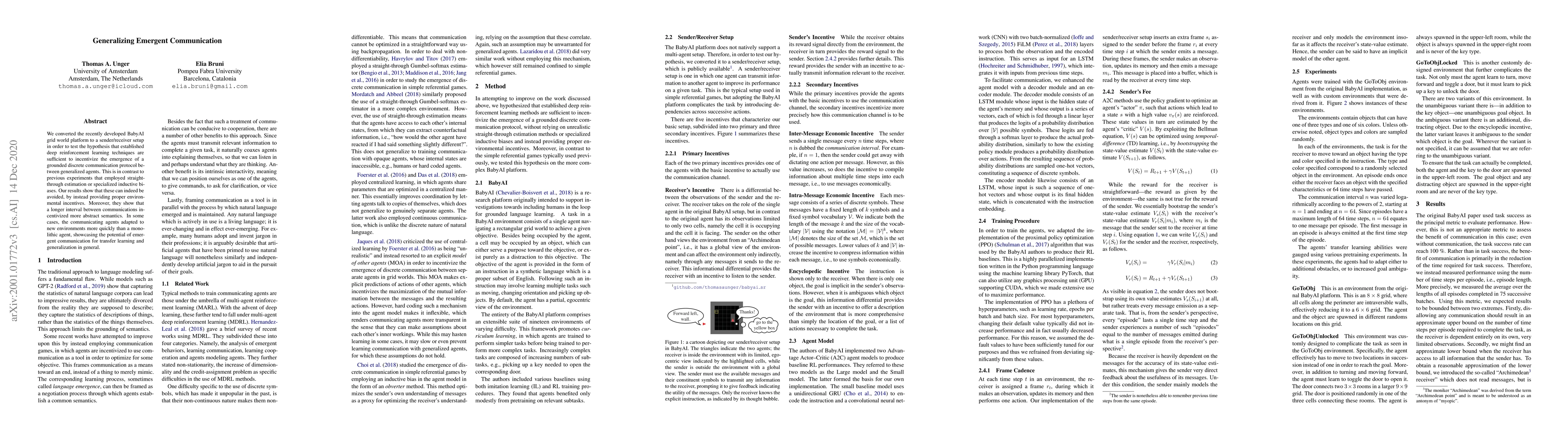 We converted the recently developed BabyAI grid world platform to a sender/receiver setup in order to test the hypothesis that established deep reinforcement learning techniques are sufficient to incentivize the emergence of a grounded discrete communication protocol between generalized agents. This is in contrast to previous experiments that employed straight-through estimation or specialized inductive biases. Our results show that these can indeed be avoided, by instead providing proper environmental incentives. Moreover, they show that a longer interval between communications incentivized more abstract semantics. In some cases, the communicating agents adapted to new environments more quickly than a monolithic agent, showcasing the potential of emergent communication for transfer learning and generalization in general.